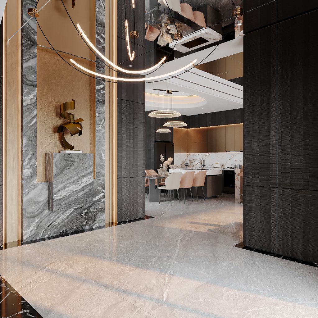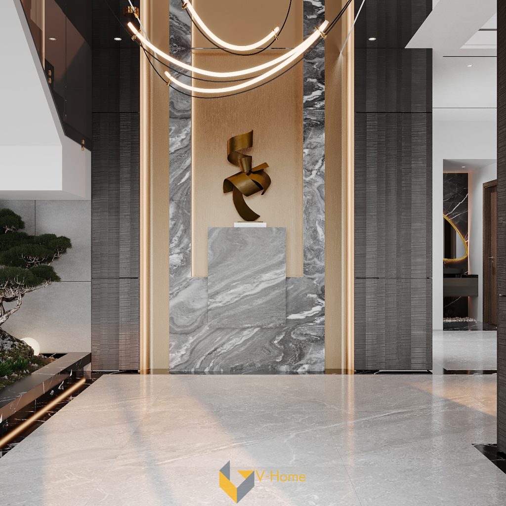 Bước qua cánh cửa chính, sảnh đón mang lại cảm giác tĩnh tại và sang trọng, như bước vào một không gian nghệ thuật đích thực. Gam màu ‘xám đá, đen marble và vàng champagne’ hòa quyện trong ánh sáng vàng ấm, khơi gợi cảm xúc tinh tế ngay từ cái nhìn đầu tiên.