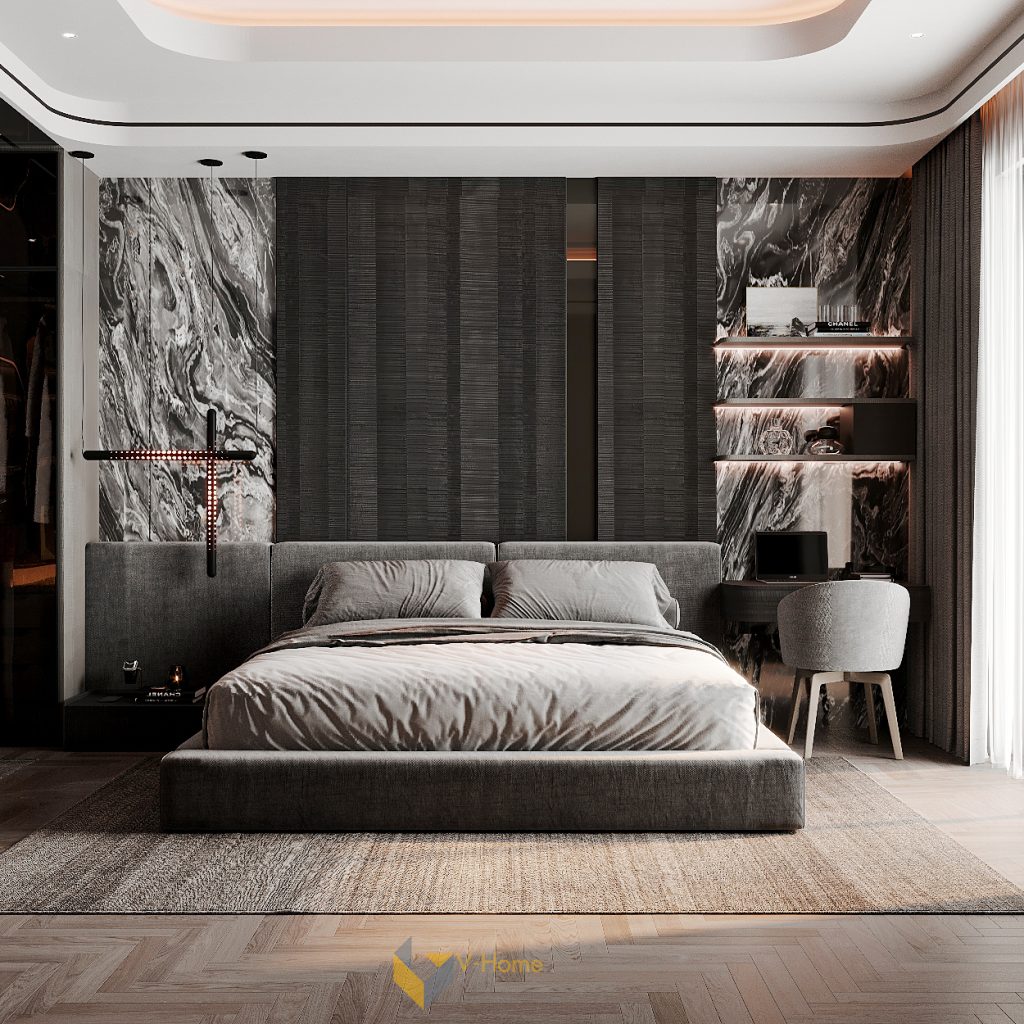 Trung tâm căn phòng là chiếc giường bọc nỉ cao cấp màu xám trung tính, đặt trên thảm dệt thủ công tone ghi nhạt. Phía sau là mảng tường ốp đá marble đen vân trắng kết hợp lam gỗ hiện đại, tạo chiều sâu mạnh mẽ và làm nổi bật hình khối của kiến trúc.