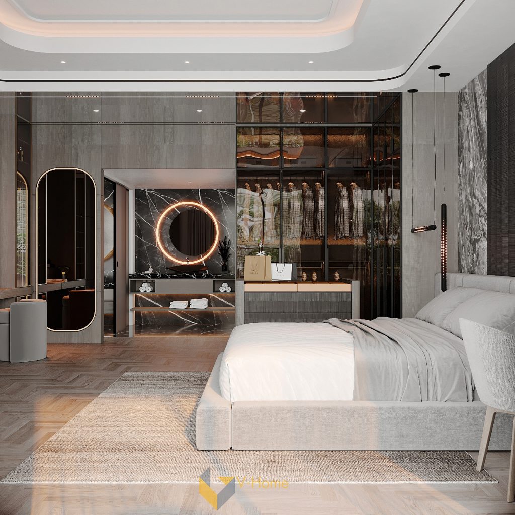V-Home mang đến một thiết kế Modern Luxury đầy tinh tế, nơi ánh sáng, vật liệu và cảm xúc hòa quyện, tạo nên không gian nghỉ ngơi vừa riêng tư, vừa giàu tính nghệ thuật. Căn phòng này chính là trái tim của sự đẳng cấp trong toàn bộ công trình.