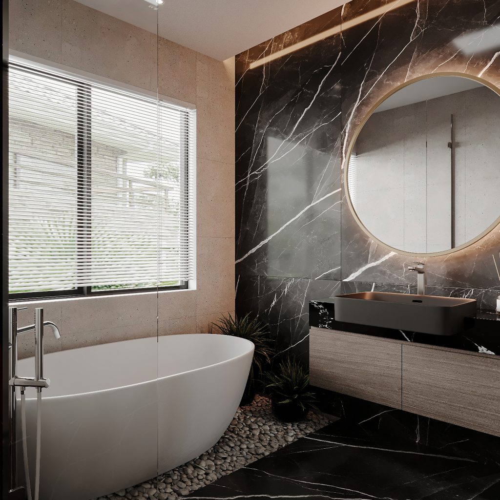 Phòng tắm liền kề là một spa thu nhỏ trong nhà, nơi V-Home đã khéo léo kết hợp đá marble đen huyền kết hợp be sáng, tạo tương phản đẳng cấp. Bồn tắm đặt sát cửa sổ lớn, bên dưới là lớp sỏi tự nhiên và mảng xanh điểm xuyết, mang hơi thở của thiên nhiên vào không gian thư giãn.
