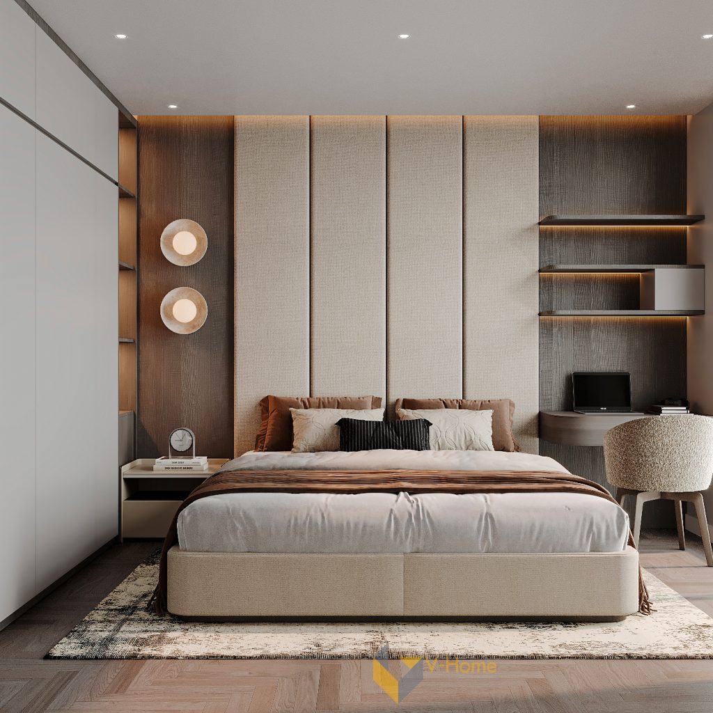 Bố cục căn phòng được V-Home xử lý khéo léo, với giường đặt trung tâm, vách đầu giường bọc nỉ kẻ dọc cao sát trần tạo hiệu ứng chiều cao, đồng thời mang đến cảm giác mềm mại, sang trọng. Hai bên là kệ đầu giường và đèn decor âm tường, vừa đảm bảo công năng vừa đóng vai trò trang trí tinh tế.