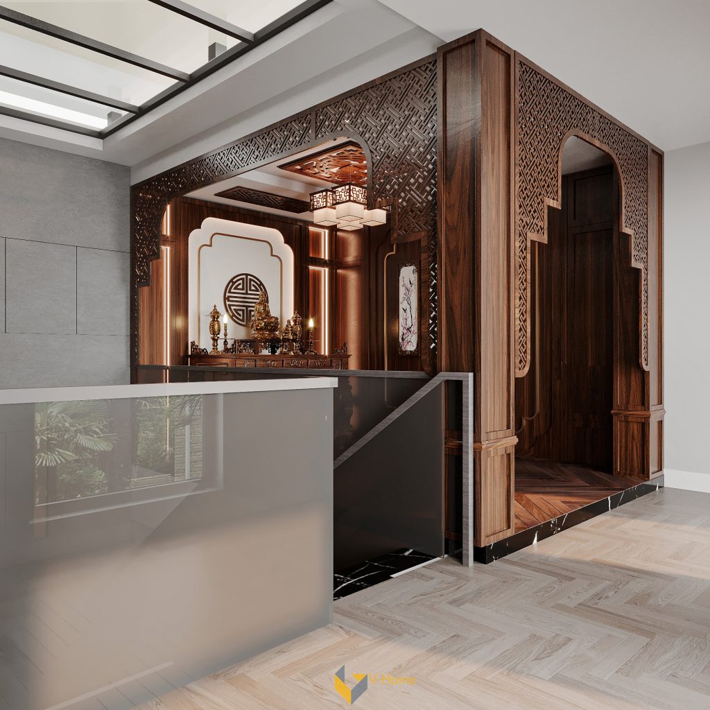 Phòng thờ được bố trí tại tầng trên cùng của ngôi nhà – một vị trí trang trọng, yên tĩnh, tách biệt khỏi khu sinh hoạt chung. V-Home đã dung hòa giữa vẻ truyền thống và tinh thần đương đại.