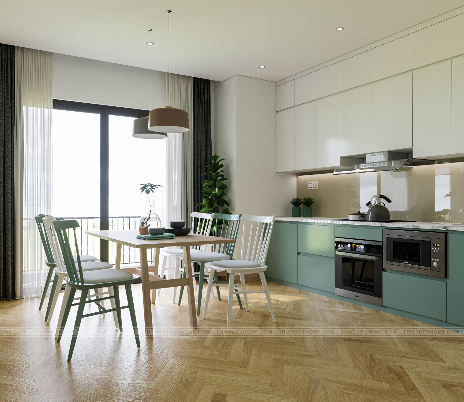 Phòng bếp và phòng ăn có khung cửa kính rộng mở đón sánh sáng tự nhiên, không gian nội thất trở lên thoáng mát và sáng sủa. Ánh sáng không chỉ đảm bảo sức khỏe cho gia chủ, mà còn tôn lên vẻ đẹp của nội thất, tăng lên giá trị của căn hộ. Tủ bếp được thiết kế cao sát trần, màu trắng mang lại hiệu ứng không gian khá tốt cho các căn hộ chung cư hạn chế về diện tích. Tủ bếp dưới màu xanh lá cây được thiết kế đầy đủ công năng, tiện ích hiện đại.