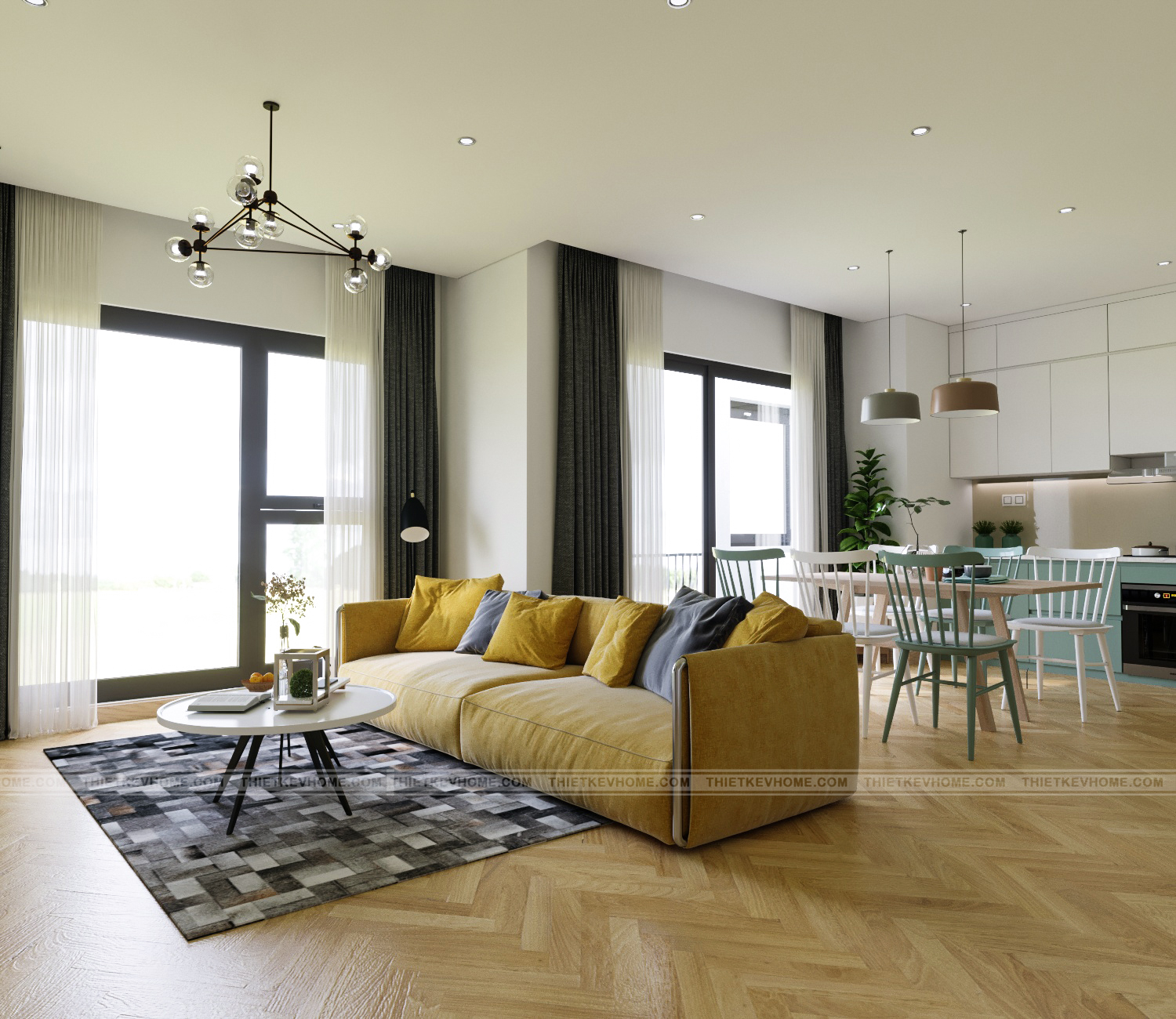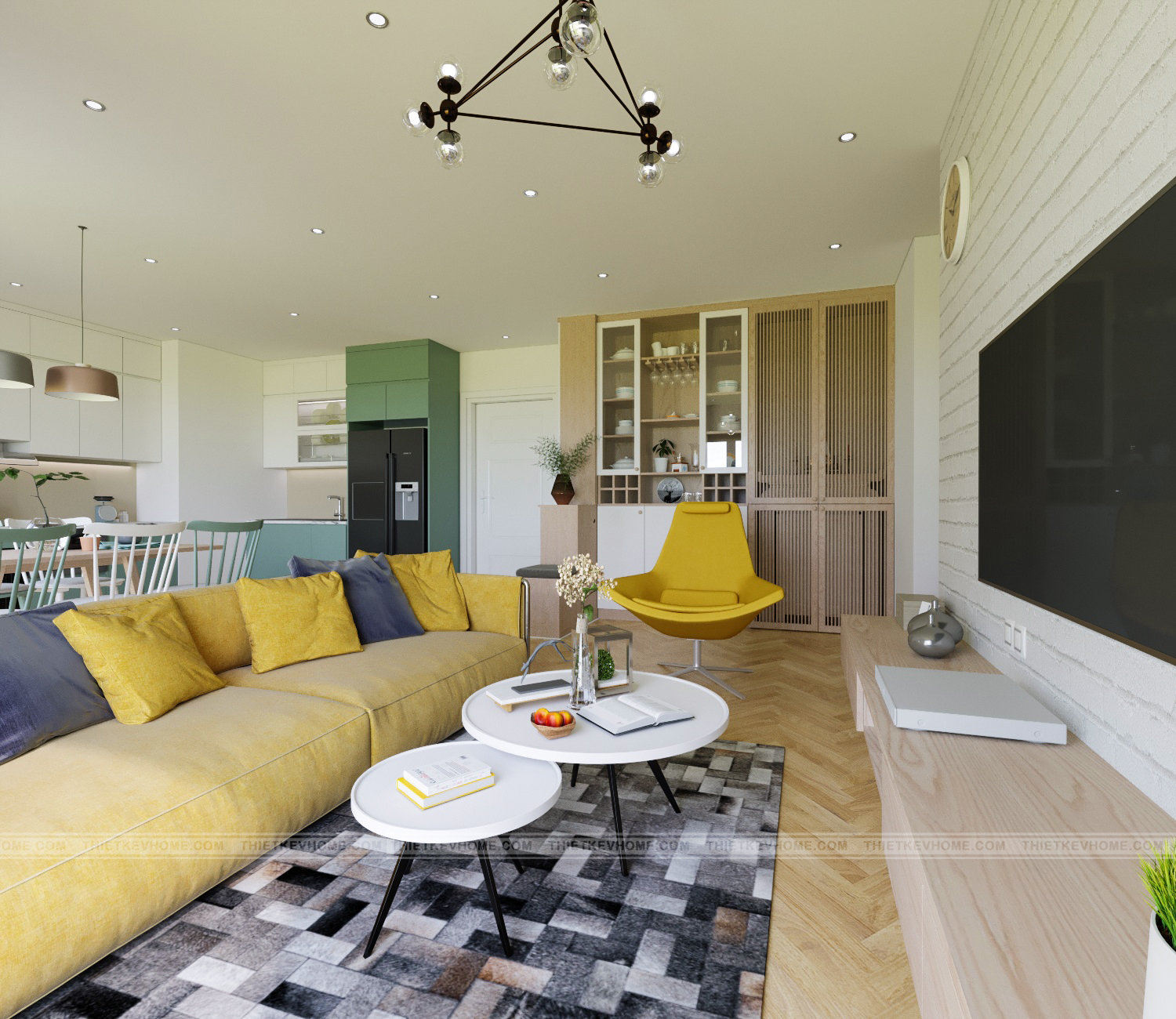 Thiết kế nội thất không gian mở, các không gian chức năng không có sự phân định rạch ròi vừa giúp gắn kết các thành viên trong gia đình, vừa mang lại khoảng không gian rộng rãi, thoáng mát. Nội thất phòng khách ấn tượng với bộ sofa bằng nỉ màu vàng, mang lại sự ấm áp cho không gian nội thất. Bộ sofa hình chữ I cùng với chiếc ghế thư giãn giúp cho các thành viên trong gia đình cùng quây quần xem ti vi. Bộ sofa quay lưng lại với nội thất phòng ăn, phòng bếp. Giữa phòng khách với phòng ăn không có bức tường ngăn cách, nên khi dùng bữa, gia chủ vẫn có thể xem phim theo thói quen của người Việt. Trần thạch cao làm phẳng đơn giản, đèn trần phòng khách góp phần tạo nên vẻ đẹp lung linh cho không gian nội thất.