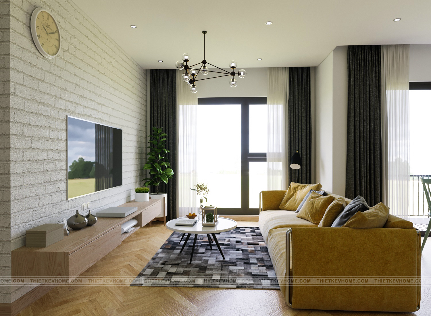 Kệ ti vi treo tường được thiết kế với đường nét đơn giản, gọn gàng. Bức tường sau ti vi được dán giấy dán tường Hàn Quốc giả gạch màu trắng tạo điểm nhấn cho nội thất phòng khách mà lại tiết kiệm chi phí.