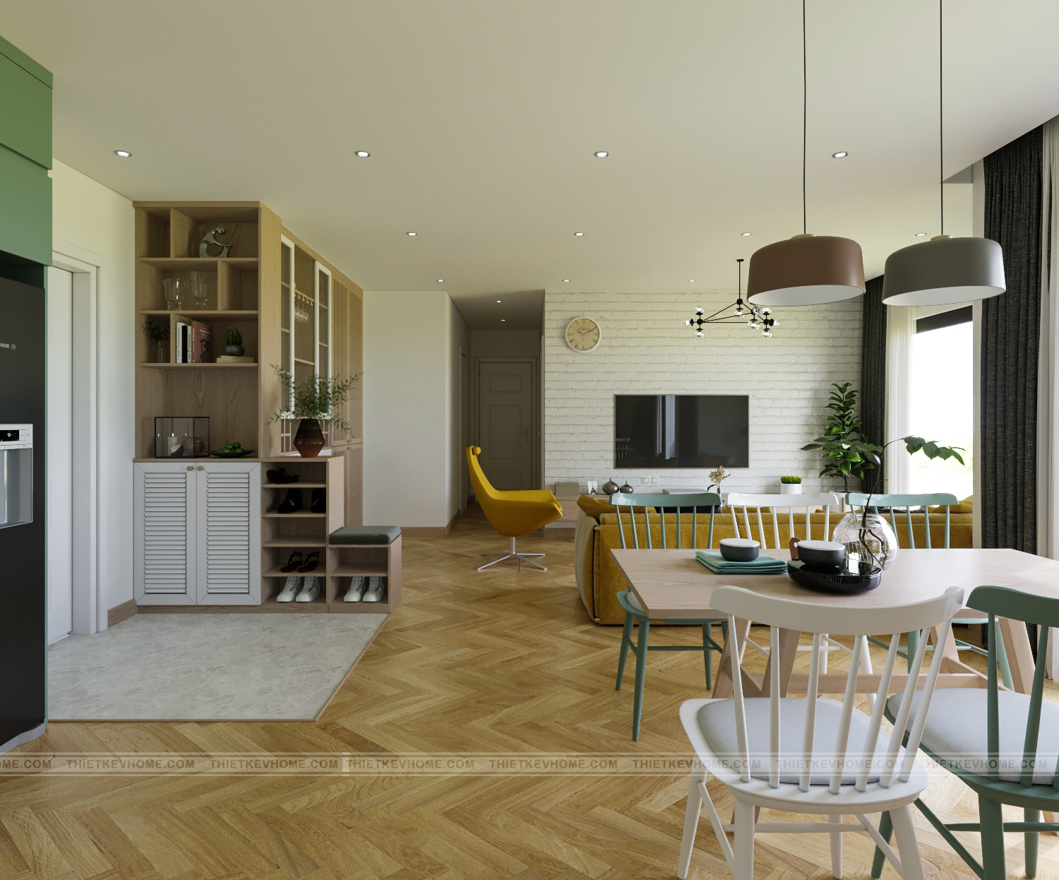 Bước vào căn hộ là toàn bộ không gian sinh hoạt chung của gia đình. Ngay cạnh cửa ra vào là tủ giày được thiết kế cao sát trần. Vuông góc là hệ thống tủ trang trí và ban thờ gia tiên. Tủ trang trí được thiết kế cánh kính trưng bày các đồ lưu niệm. Ở giữa là có giá treo ly ngược và các ô để chứa chai rượu vang. Tủ thờ gia tiên được thiết kế có cánh cửa đóng lại để đảm bảo sự yên tĩnh cho không gian thờ cúng. Kiến trúc sư không sử dụng cánh kín mà sử dụng cánh nan để vẫn đảm bảo sự thông thoáng.