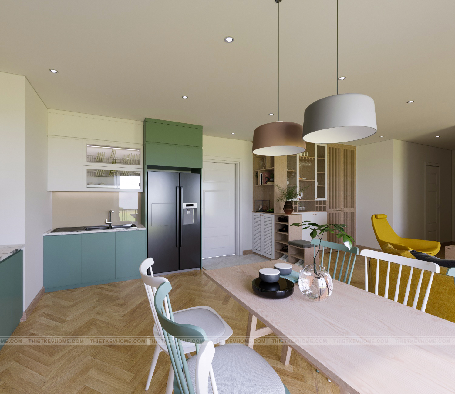 Thiết kế nội thất phòng ăn với những đường nét thiết kế đơn giản, hiện đại nhưng được sử dụng màu sắc pastel rất hợp xu thế mang đến một không gian nội thất mới lạ, độc đáo, mang lại hứng thú cho bà nội trợ. Bàn ăn 6 ghế bằng gỗ tự nhiên với cách sắp xếp ghế so le hai màu xanh lá cây và màu trắng vô cùng thú vị. Tủ bếp cũng được kết hợp bởi hai màu xanh và trắng. Đèn thả bàn ăn mang lại vẻ đẹp huyền ảo, sống động cho khu vực này.