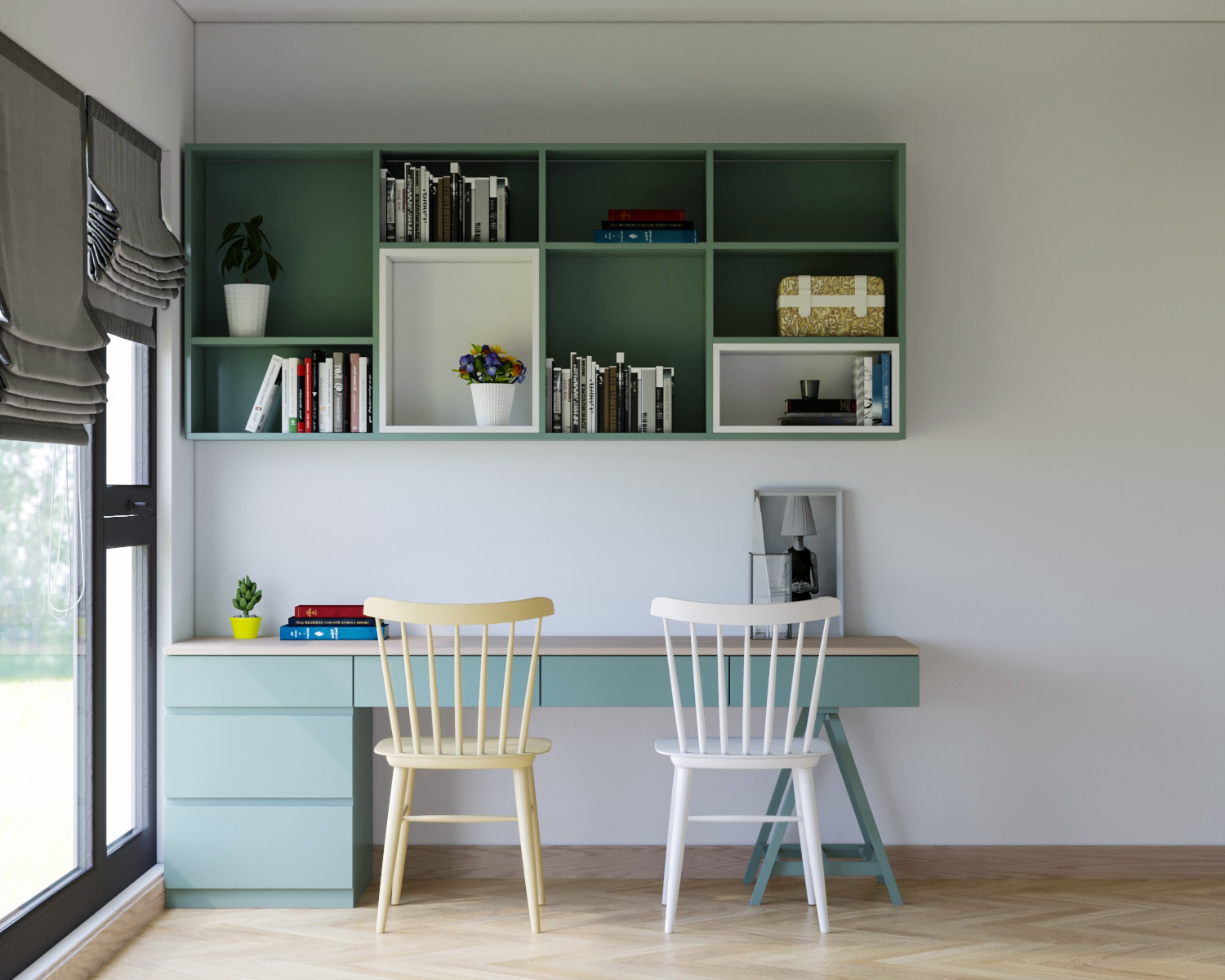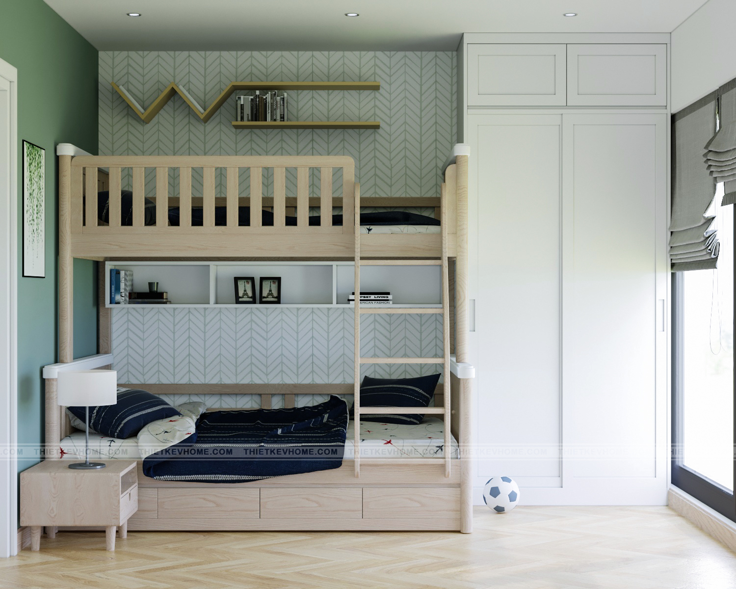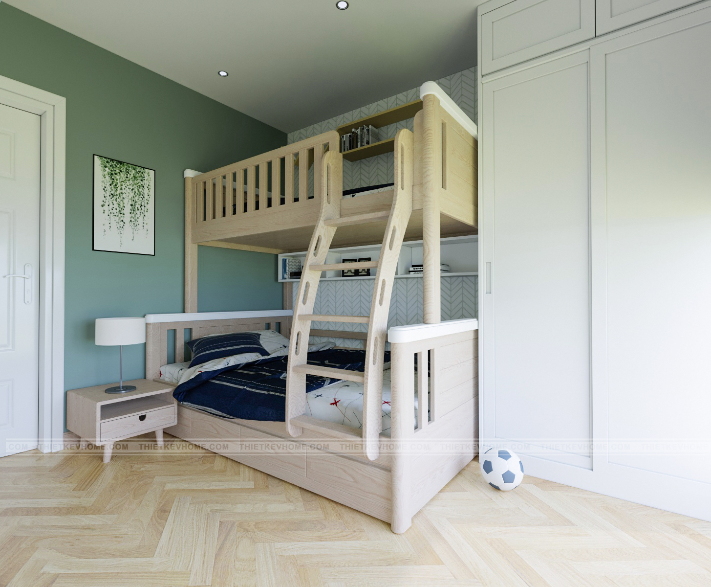 Nội thất chung cư 2 phòng ngủ nên không có không gian riêng cho mỗi con, cũng không quá rộng rãi để bố trí hai giường khác nhau nên lựa chọn giường tầng là một lựa chọn hợp lý. Giường tầng vừa tiết kiệm không gian vừa giúp mỗi bé có một giường riêng, đảm bảo riêng tư. Tủ quần áo cánh trượt để tiết kiệm không gian lưu thông cho không gian phòng ngủ trẻ, trẻ có nhiều không gian để họp tập và vui chơi.