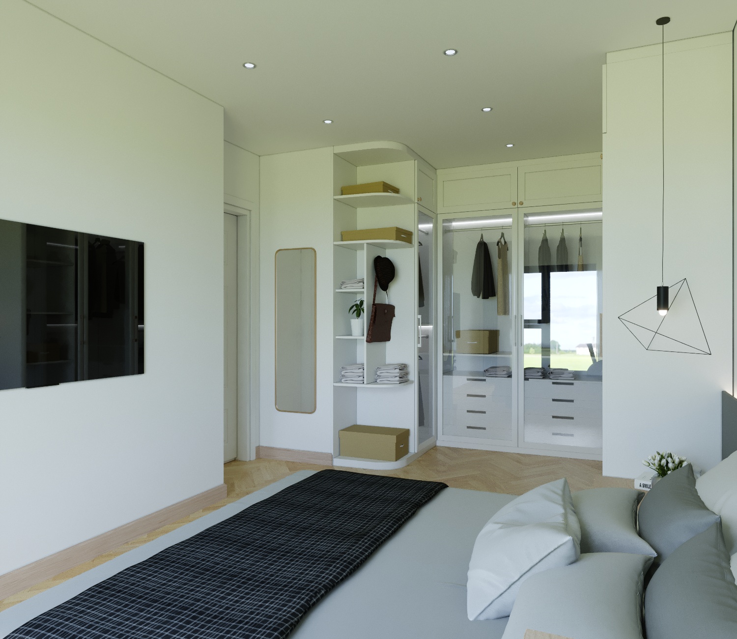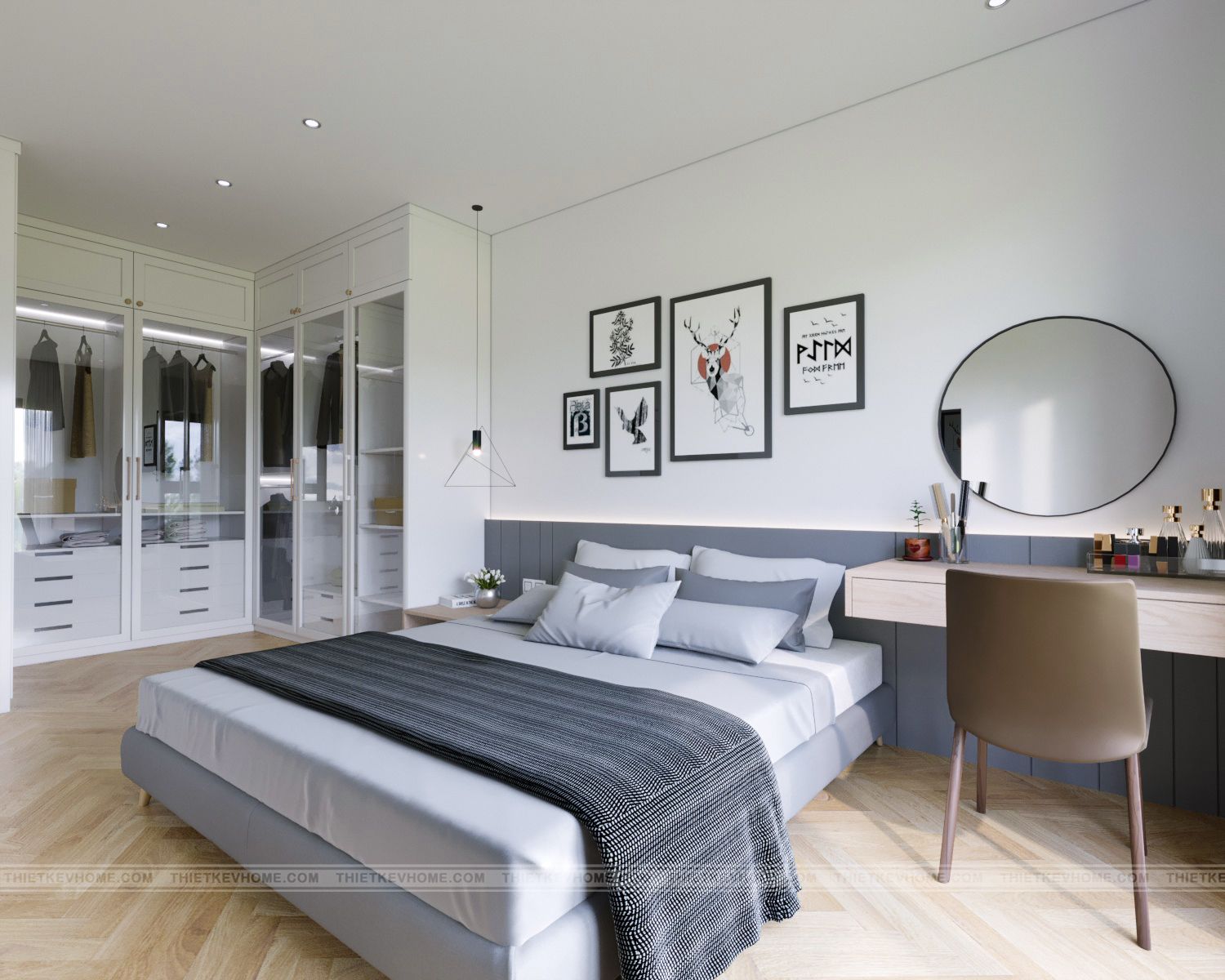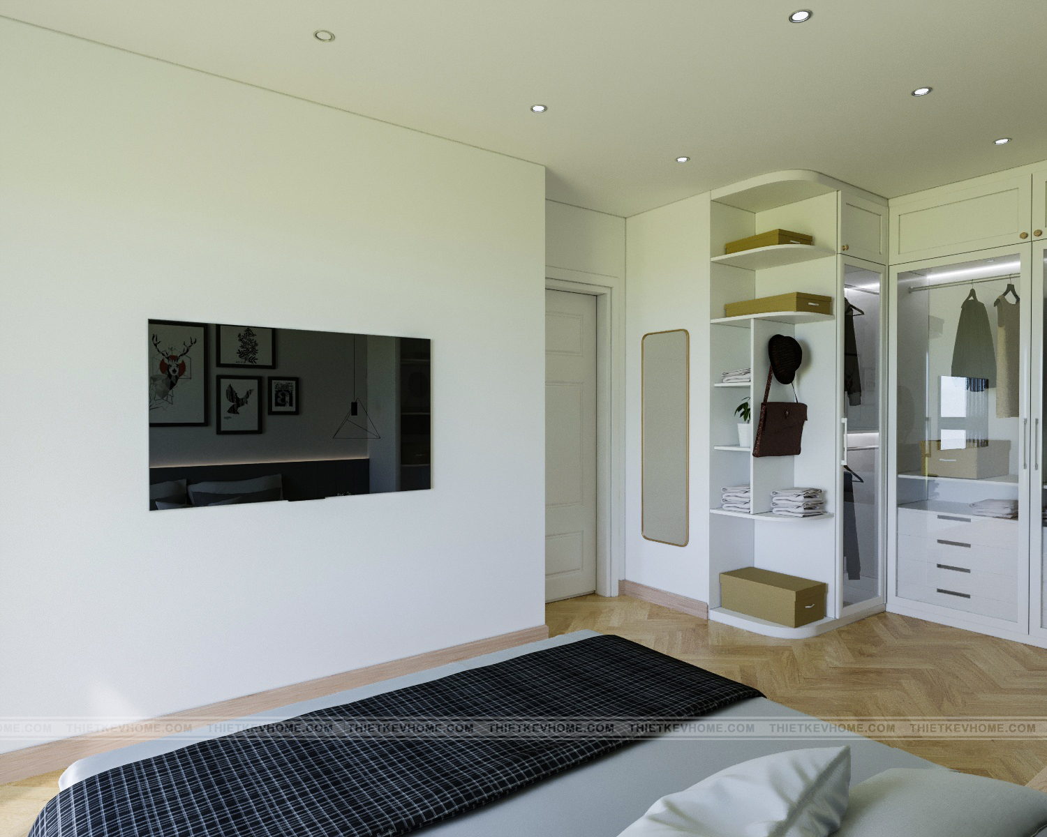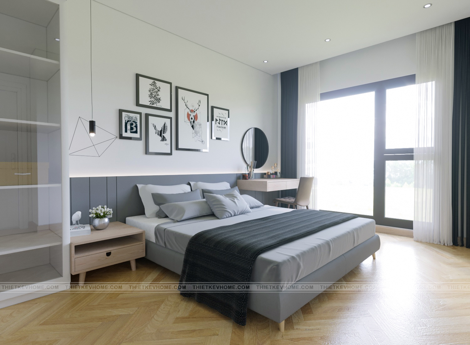 Thiết kế nội thất phòng ngủ master theo phong cách hiện đại mang một vẻ đẹp rất Tây. Sau những làm việc mệt mỏi, có thể ngả lưng trên chiếc giường êm ái trong một không gian sang trọng, tinh tế như thế này thì còn gì có thể tuyệt vời hơn nữa. Giường ngủ được thiết kế với bọc da cao cấp mang lại sự êm ái, nâng niu giấc ngủ cho gia chủ. Nội thất phòng ngủ bao trùm bởi sắc trắng thanh lịch, tinh tế. Căn phòng ngủ như rộng mở, khoáng đạt hơn.