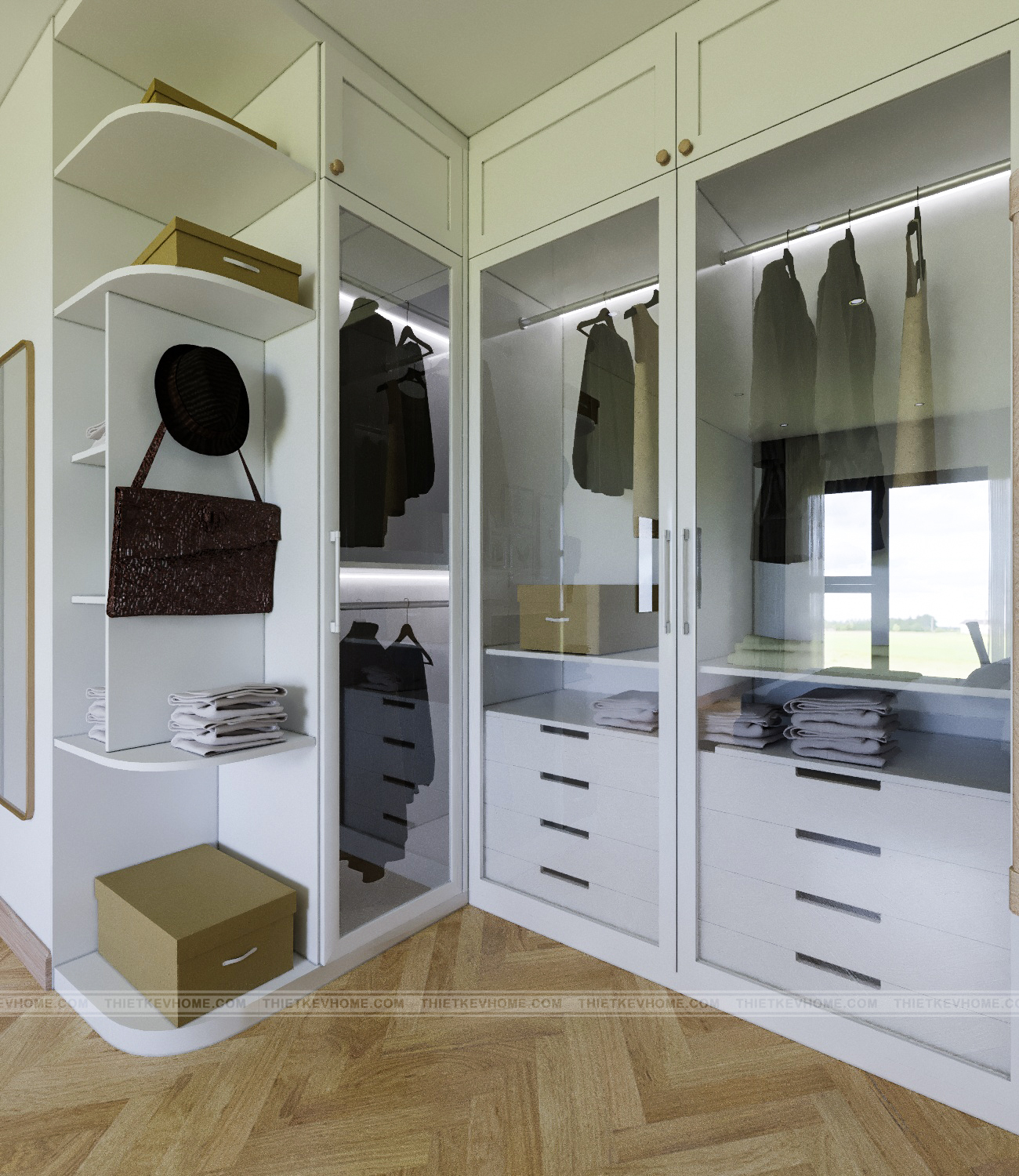 Tủ bếp cánh kính khiến không gian nội thất không còn bí bách và chật chội. Ánh đèn led được sử dụng tạo nên vẻ đẹp lung linh của nội thất, giúp gia chủ khoe những bộ cánh đẹp đẹp, những phụ kiện hàng hiệu.