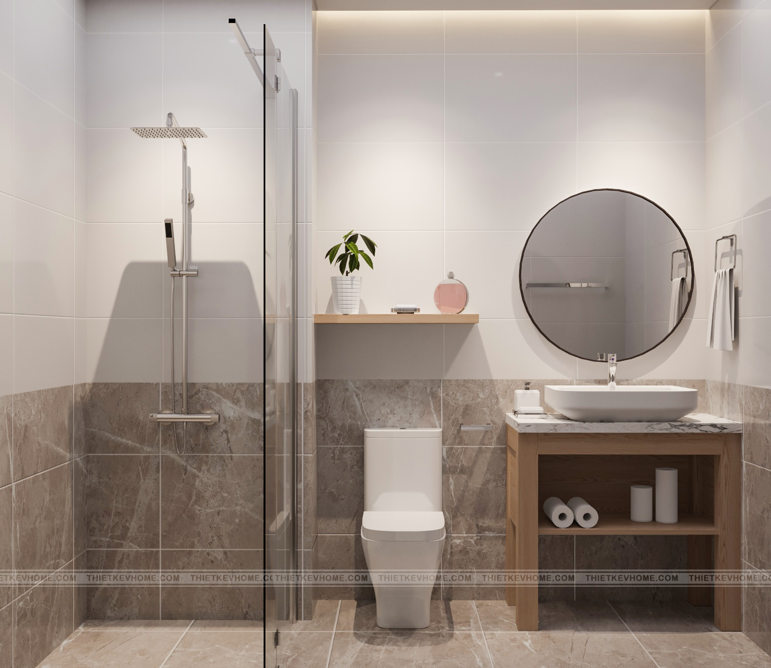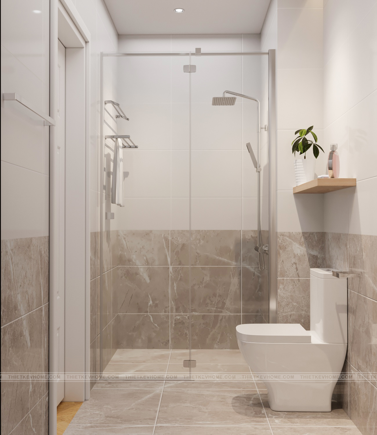Thiết kế phòng wc phòng ngủ master được ốp lát gạch với hai tông màu, tông màu nền và phần tường phía dưới màu đậm để luôn tạo cảm giác sạch sẽ cho gia chủ, tông màu tường thì sáng trắng tạo cảm giác không gian rộng rãi, thoáng đãng, Vách kính tắm đứng được sử dụng để ngăn chia không gian tắm và không gian bên ngoài để luôn đảm bảo sự sạch sẽ, khô thoáng cho không gian bên ngoài.