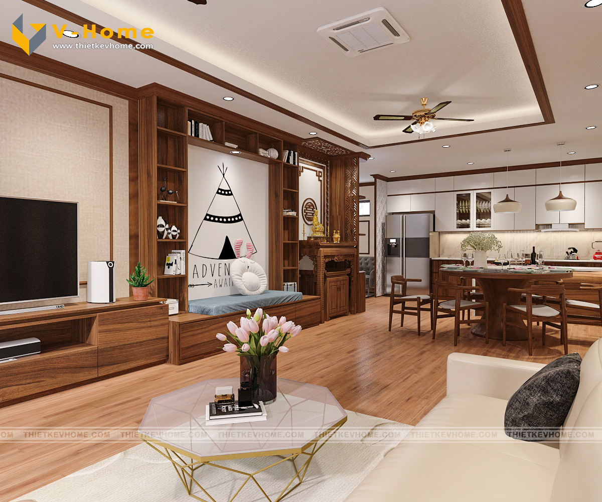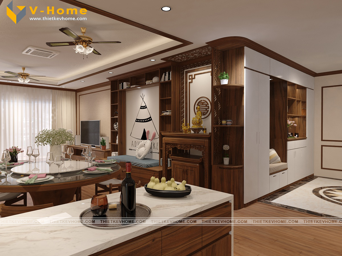 Kệ ti vi, kệ trang trí kết hợp sofa bed liên hoàn tạo thành một chỉnh thể thống nhất. Sofa bed ở không gian sinh hoạt chung, vừa giúp gia chủ nghỉ ngơi, thư giãn đọc sách, vừa là không gian vui chơi của trẻ nhỏ. Tiếp theo là bàn thờ gia tiên, bàn thờ gia tiên được ngăn cách với các không gian khác bởi vách CNC, vừa thông thoáng, vừa hợp phong thủy, mang hiển vinh phú quý đến cho gia chủ.