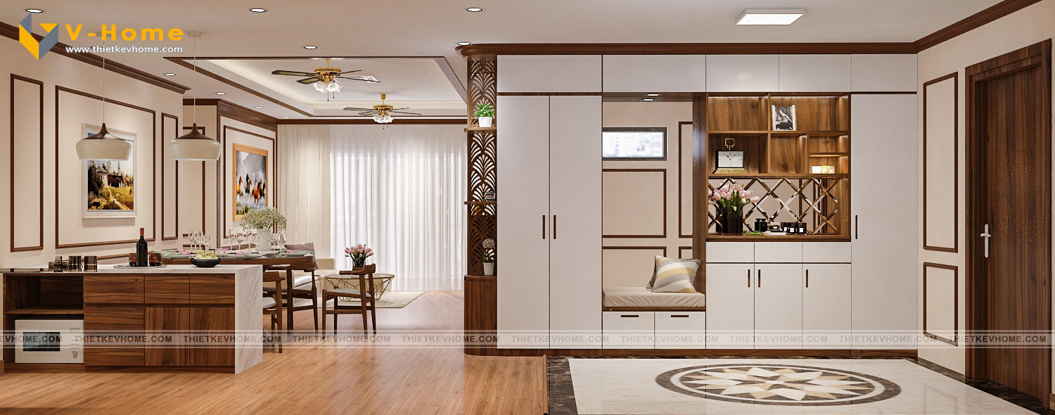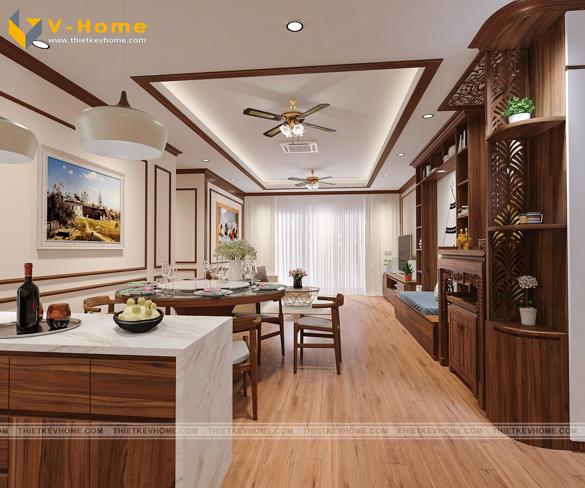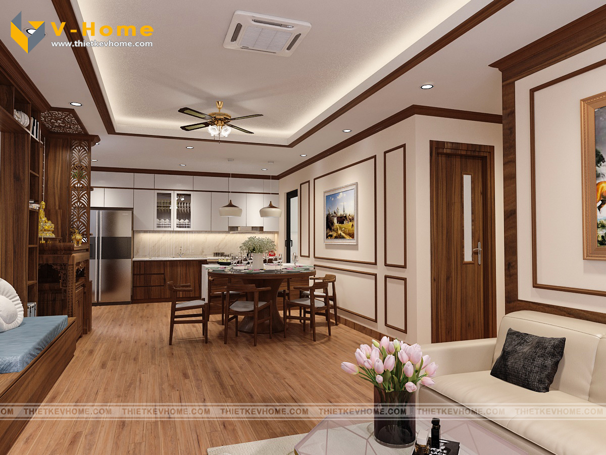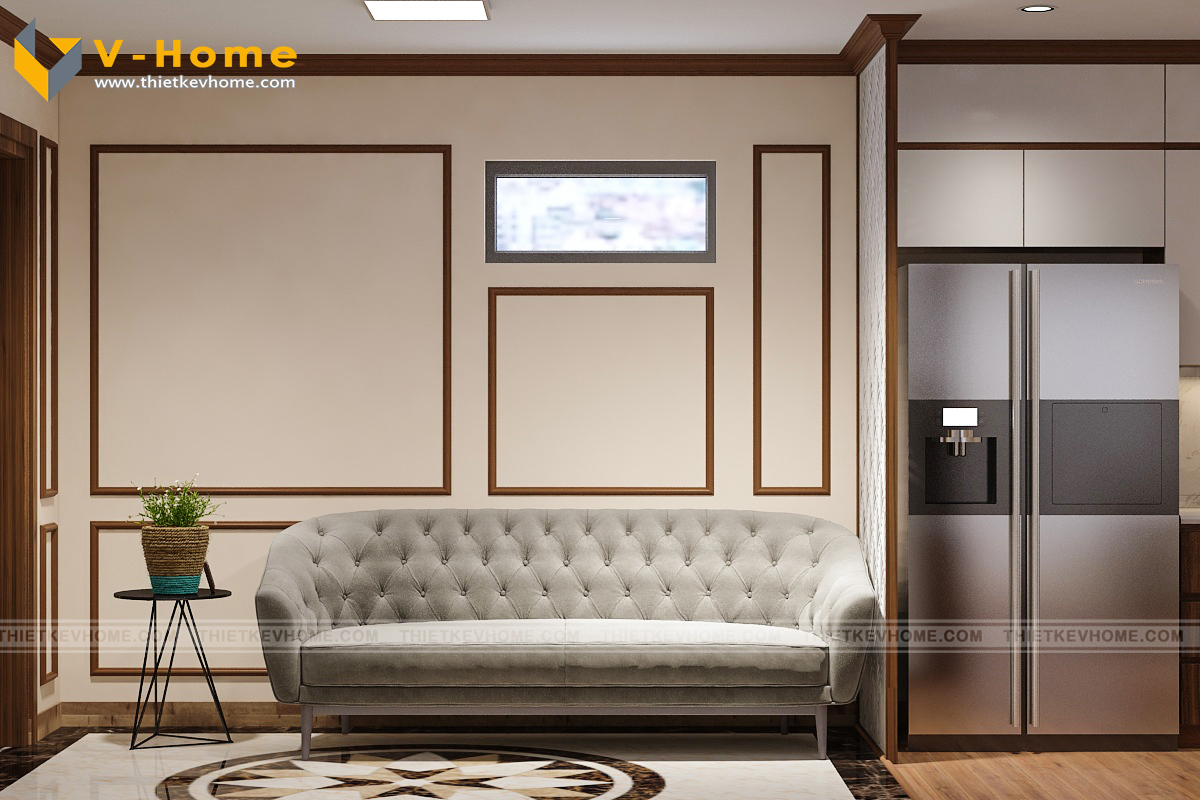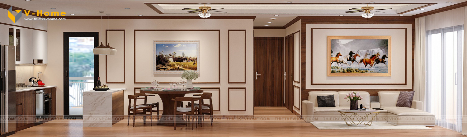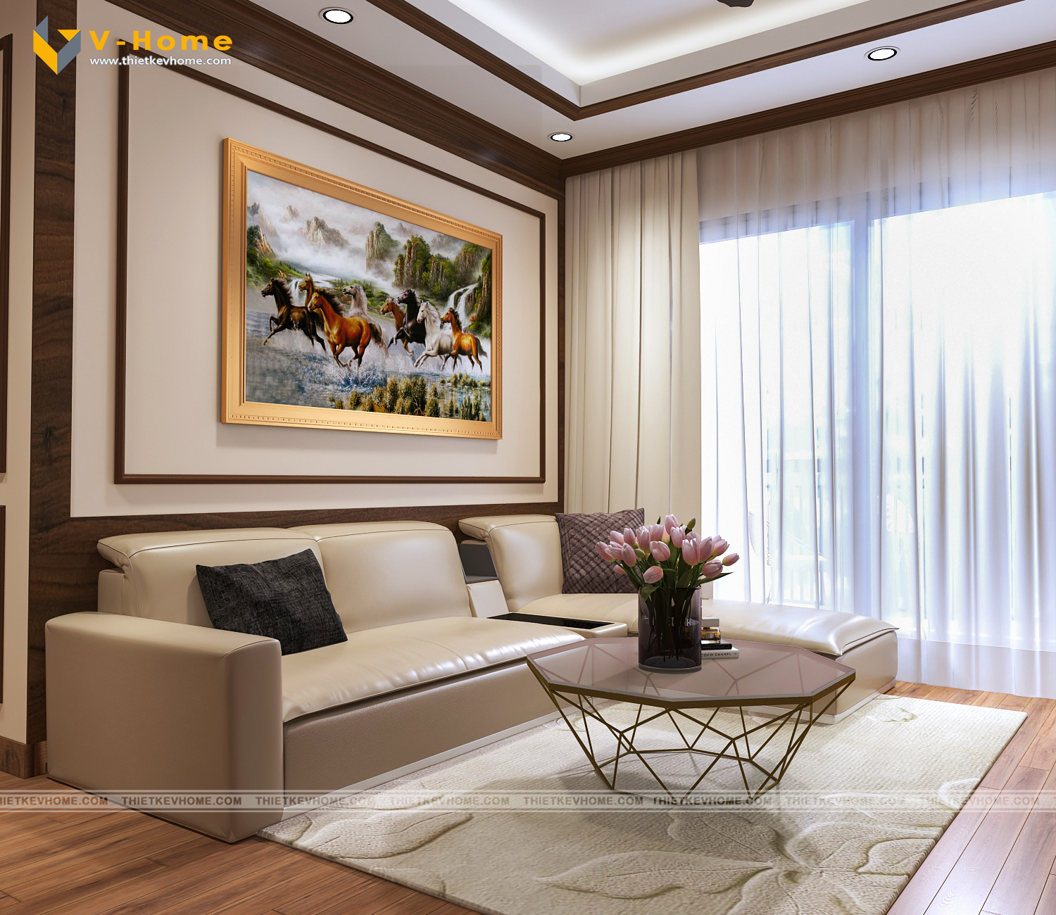 Nội thất phòng khách được bố trí sắp xếp phía cửa ban công, tận dụng tối đa ánh sáng tự nhiên, khung cửa kính rộng mở hướng sáng giúp không gian sống trở lên thoáng đãng và khỏe khoắn. Các đường phào chỉ trong không gian nội thất đều sử dụng phào chỉ bằng gỗ tự nhiên óc chó, bền bỉ và chắc chắn, góp phần giúp không gian sống của gia chủ thêm sang trọng và đẳng cấp. Không gian phòng khách và phòng ăn đều sử dụng các đường phào tạo khung, treo tranh trang trí. Kiến trúc sư V-Home lựa chọn bức tranh “mã đáo thành công” với mong muốn gia chủ luôn thành công trong công danh và sự nghiệp, tiền tài rộng mở.