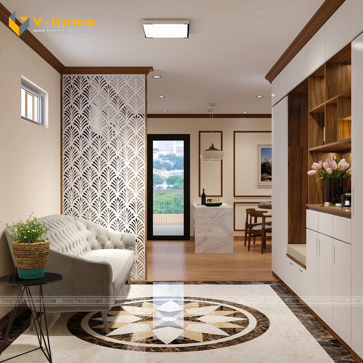 Thiết kế sofa ở sảnh đối diện với tủ giày, ngay lối đi vào cửa chính.