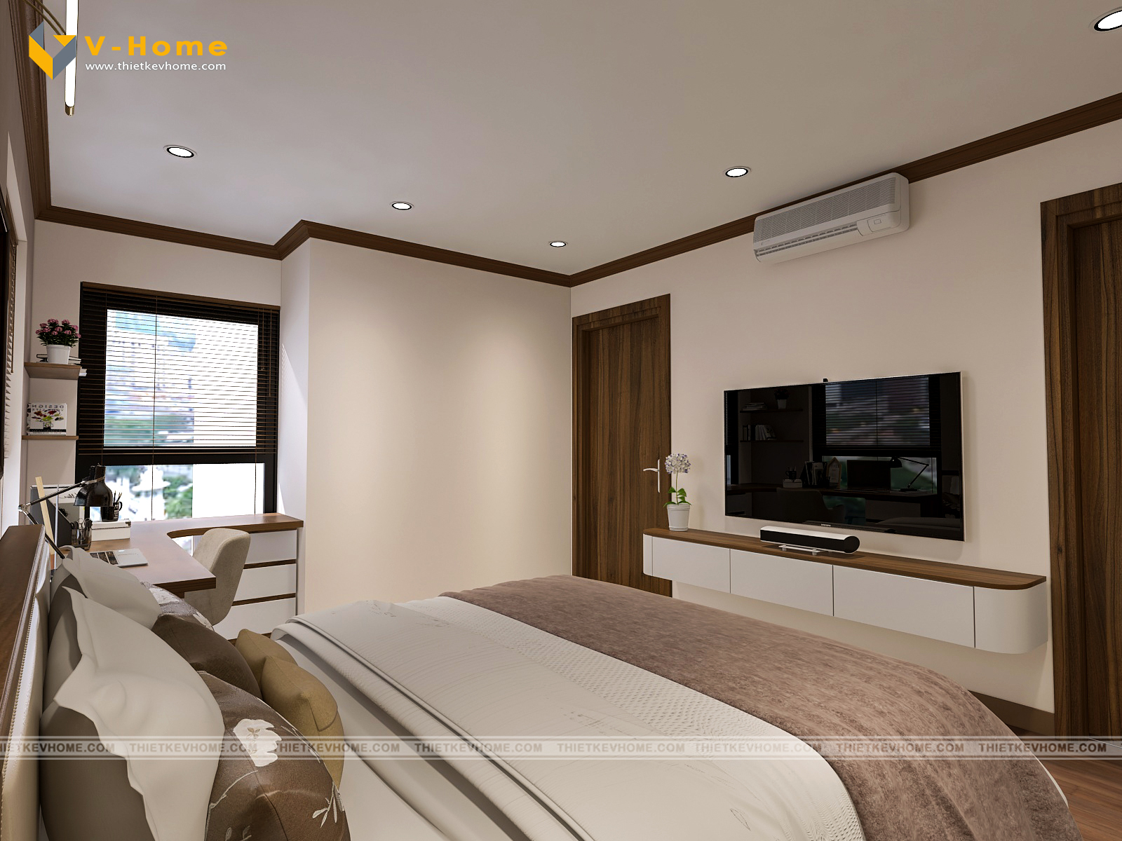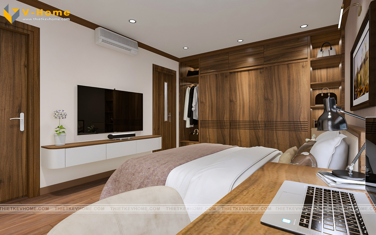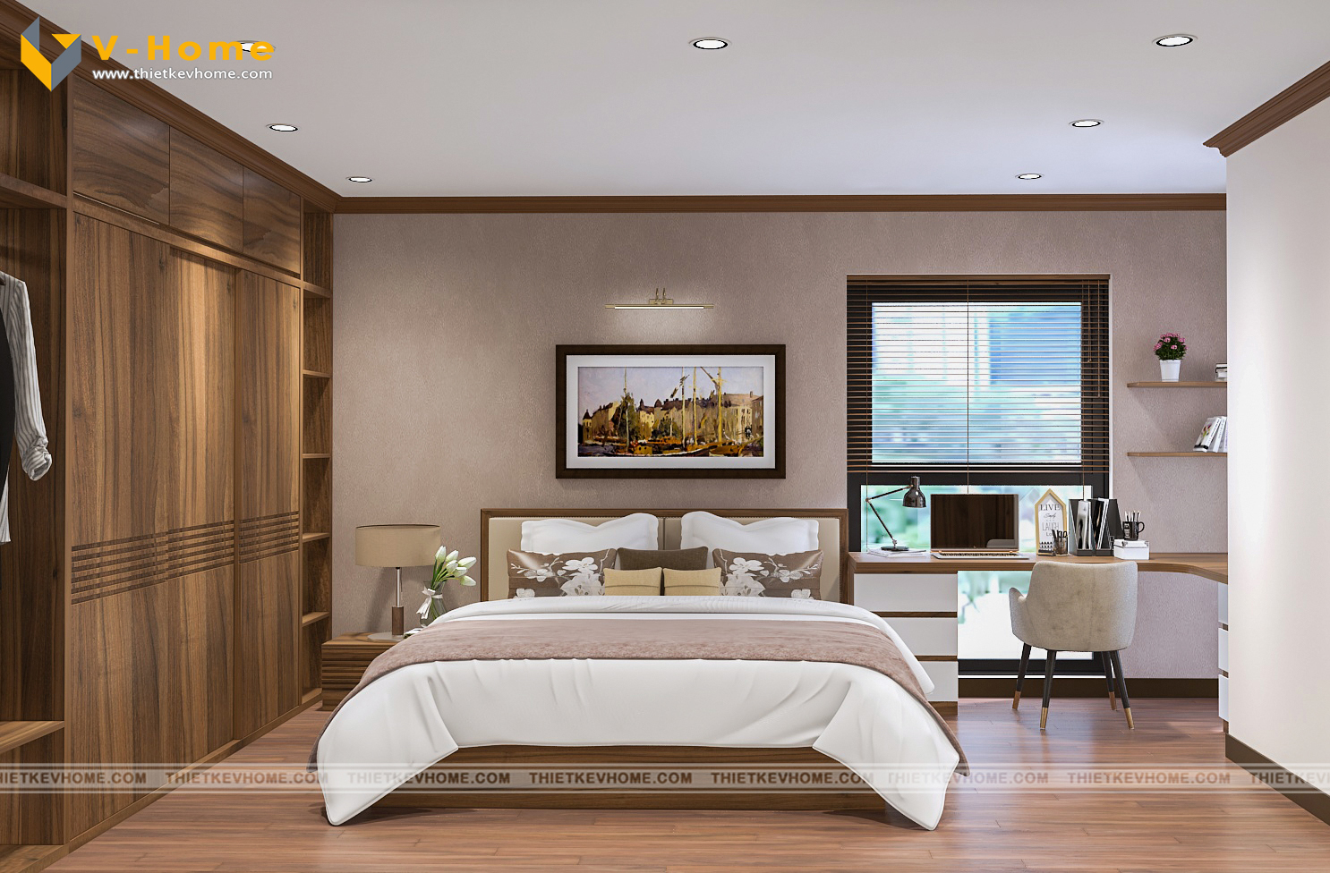 Thiết kế nội thất phòng ngủ master mang một màu nâu óc chó ấm áp và gần gũi, giúp gắn kết các thành viên trong gia đình. Thiết kế phòng ngủ master với phong cách hiện đại nhưng tinh tế, sang trọng và đẳng cấp. Gỗ óc chó tự nhiên với vân gỗ sóng sánh mang lại cho không gian nội thất vẻ đẹp uyển chuyển, mềm mại và quyền quý. Giường ngủ gỗ tự nhiên óc chó chắc chắn, bền bỉ, đệm da tựa lưng êm ái.