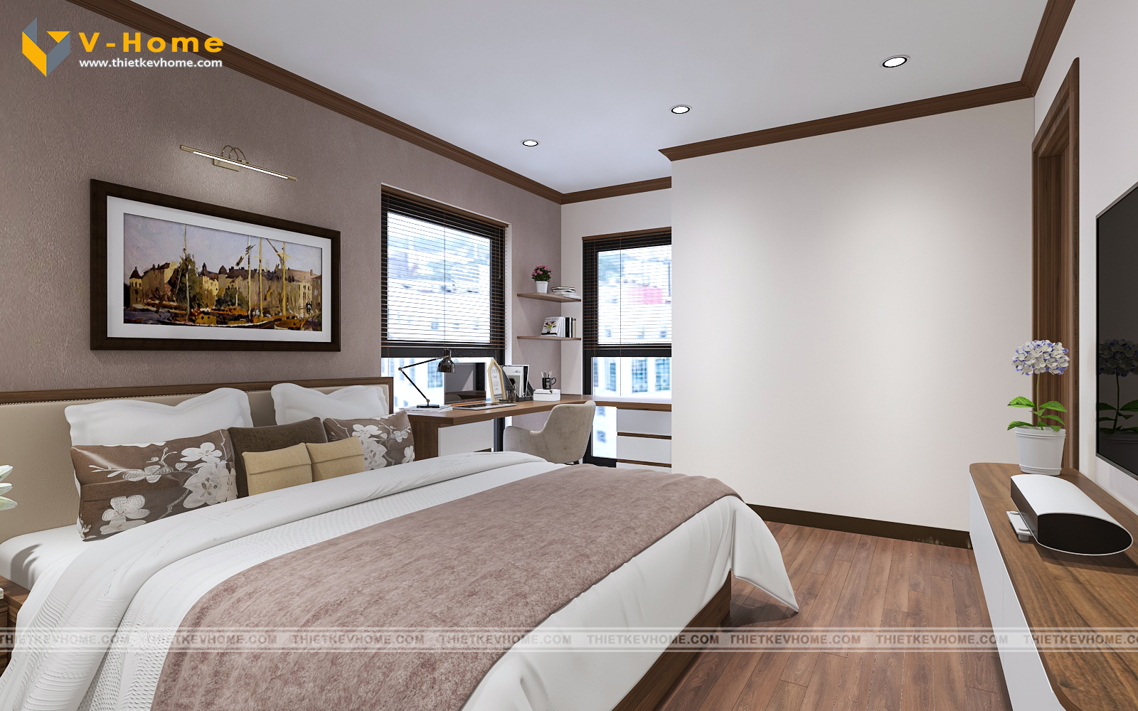 Bàn làm việc được thiết kế gần cửa sổ, tận dụng tối đa ánh sáng tự nhiên giúp gia chủ luôn thành công trong công việc, suôn sẻ và thuận lợi.