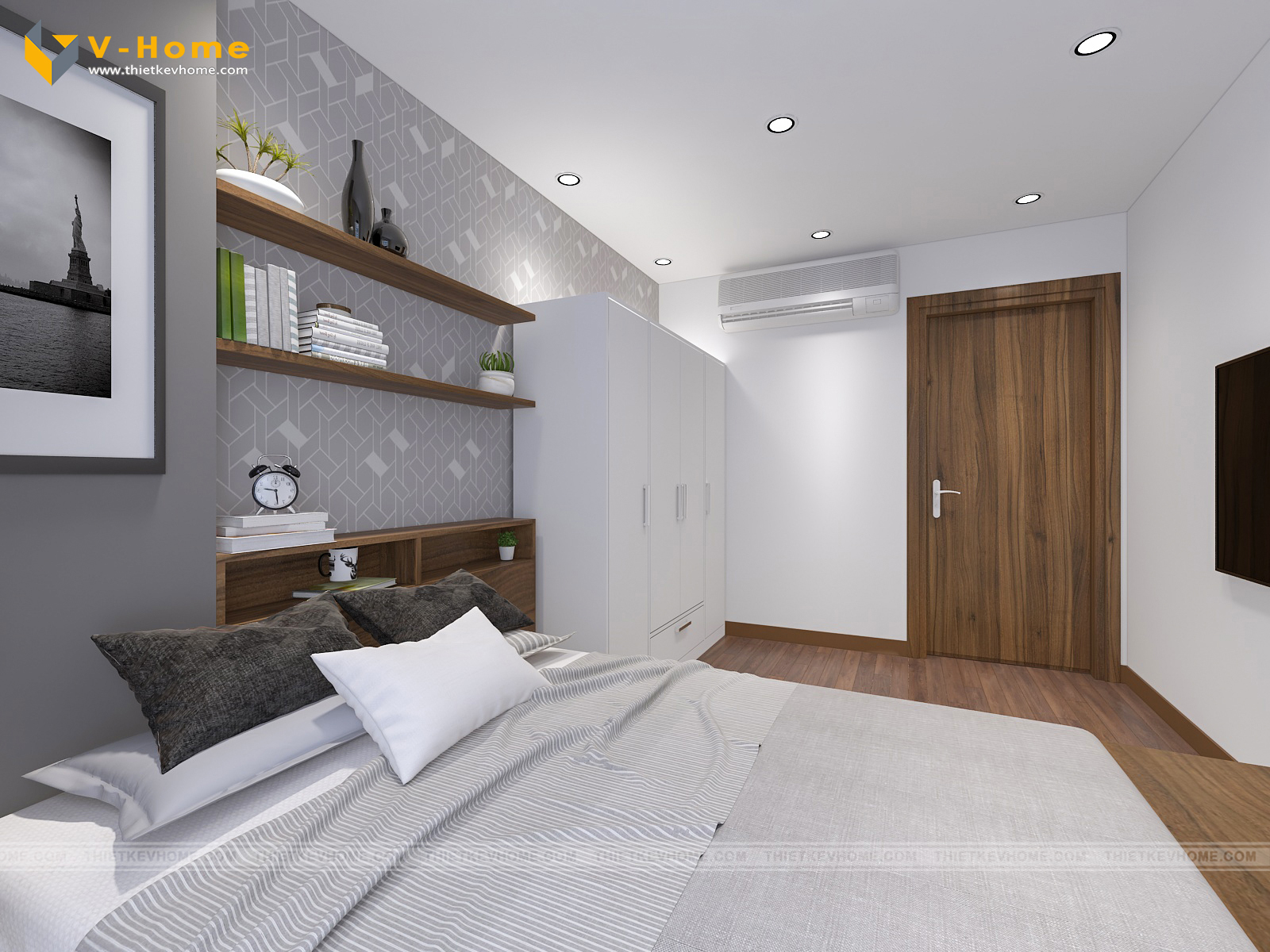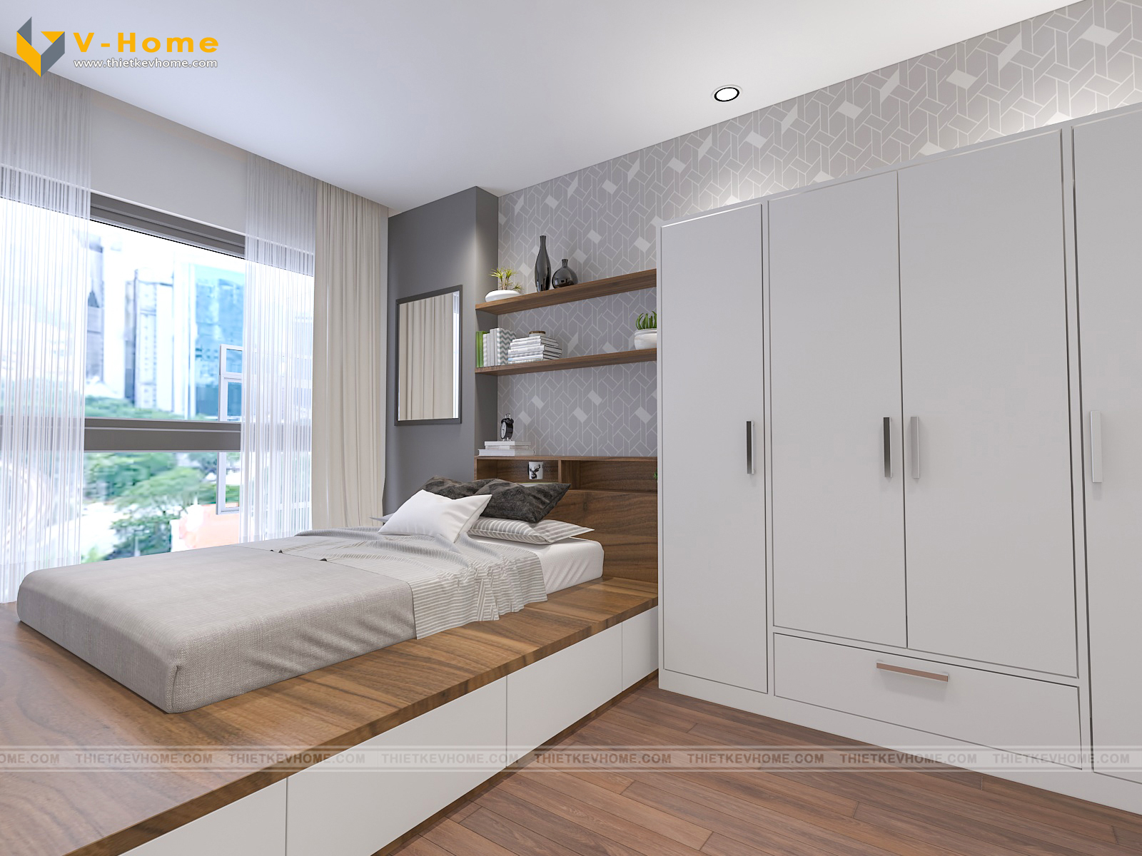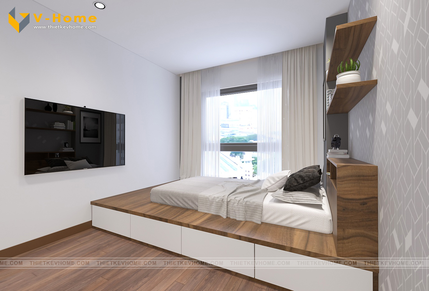 Thiết kế nội thất phòng ngủ 2 với hệ giường nâng cấp, có hệ thống ngăn kéo, ray trượt. Phòng ngủ có diện tích nhỏ nên thiết kế đủ đảm bảo công năng, không sử dụng quá nhiều đồ đạc, trang trí rườm rà nhằm tối ưu diện tích, mang lại cho không gian nghỉ ngơi sự thông thoáng và rộng rãi.