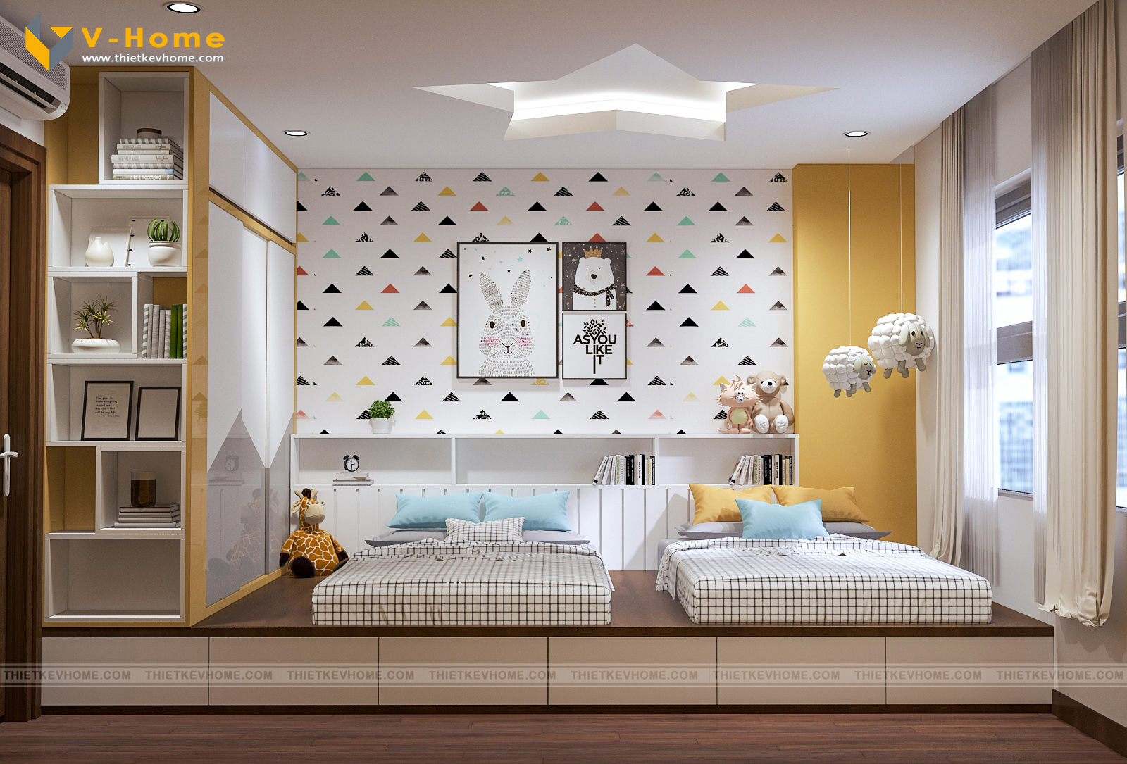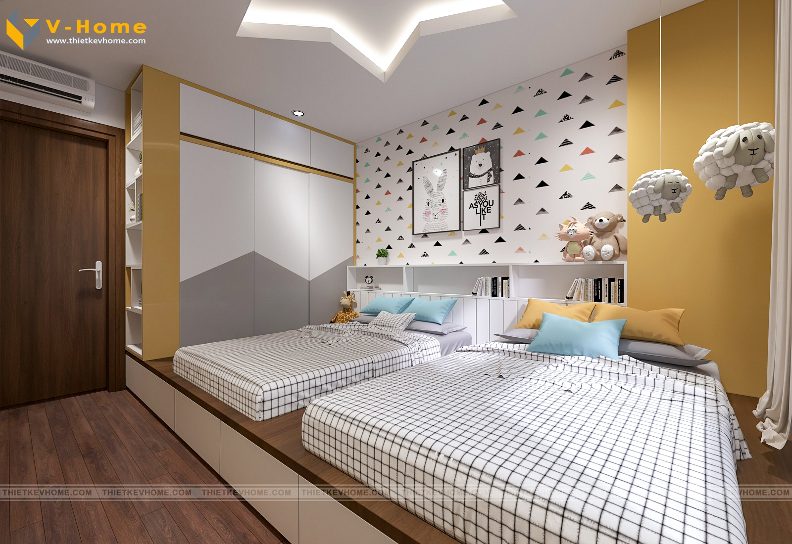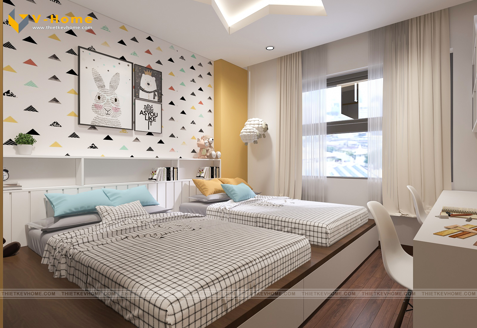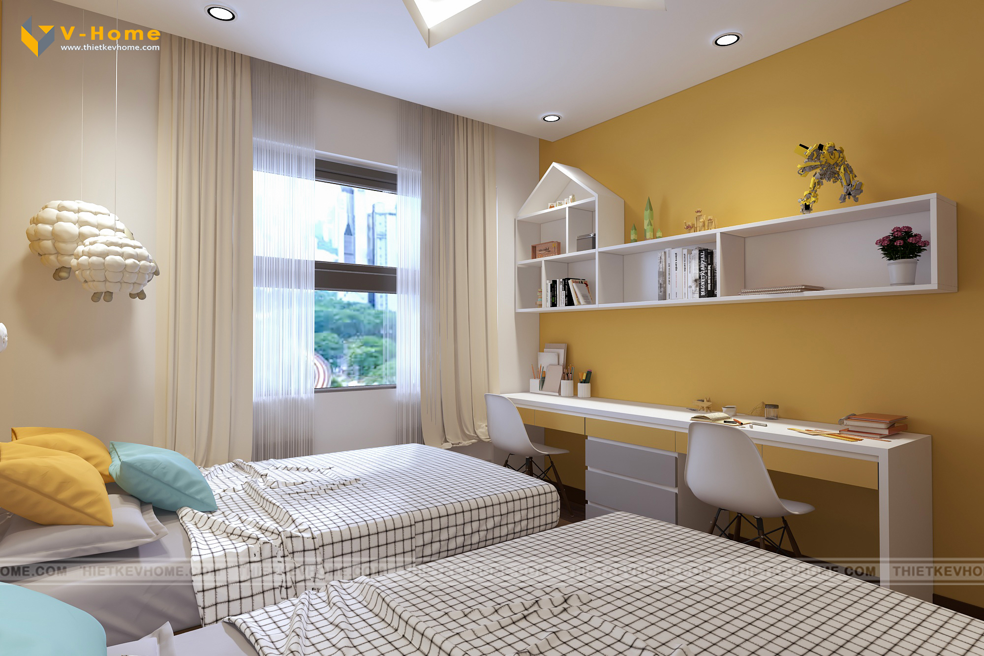 Thiết kế nội thất phòng ngủ con cho hai bé sử dụng chung. Kiến trúc sư và gia chủ không sử dụng giường tầng cho không gian này, vì phương pháp sử dụng giường tầng chỉ mang tính thời điểm. Bài toàn đặt ra là làm sao để cho hai bé vừa có không gian nghỉ ngơi riêng, vừa đảm bảo sự rộng rãi cho các bé học tập và vui chơi. Dưới đây là phương pháp xử lý của các kiến trúc sư V-Home: