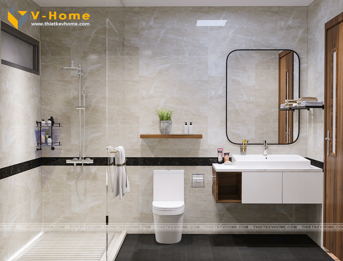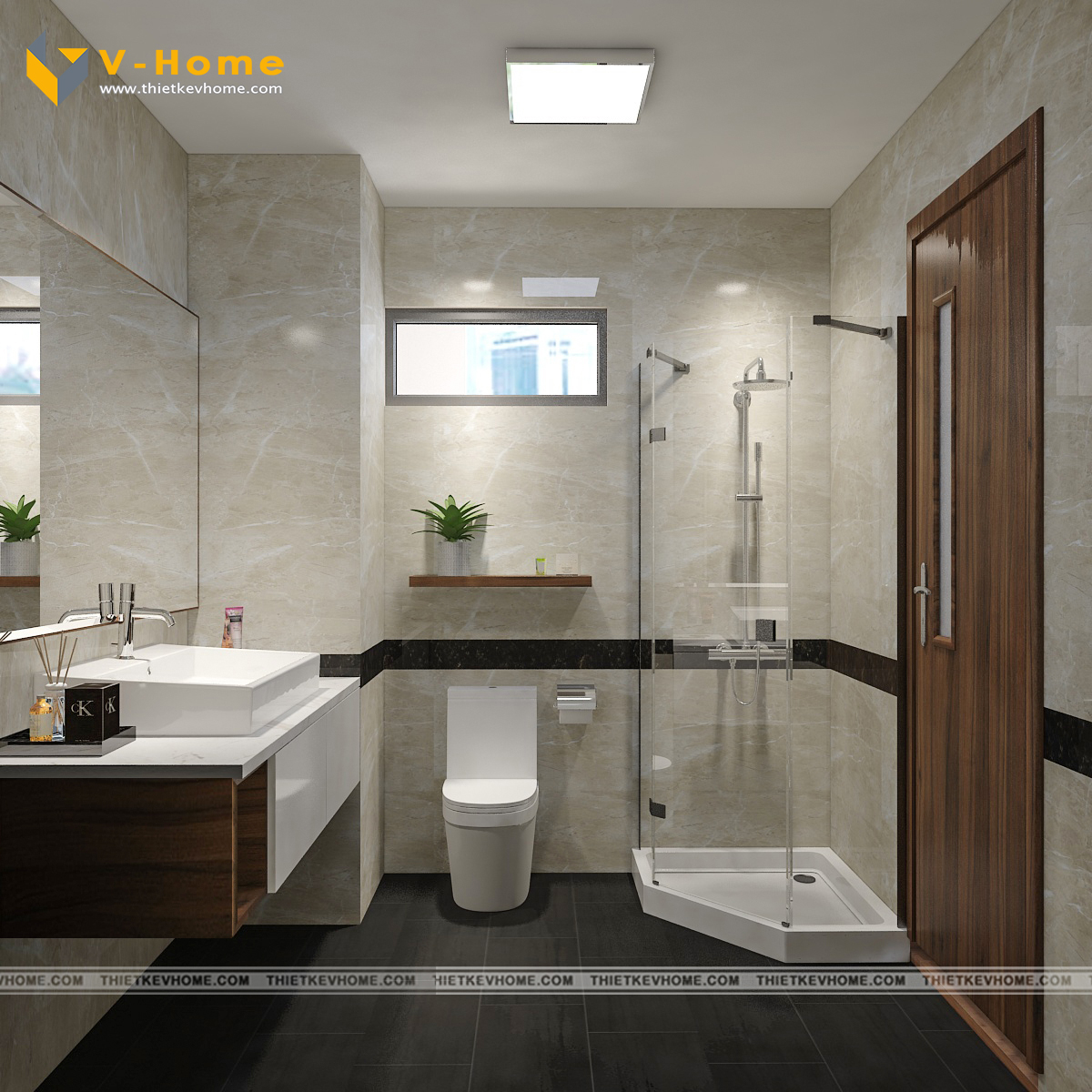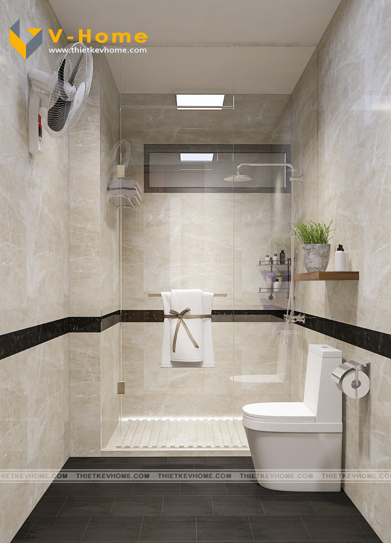 Thiết kế phòng wc được ốp đá marble quắc vân sang trọng, tinh tế giúp gia chủ có một không gian thư giãn sau một ngày làm việc mệt mỏi. Phòng tắm sử dụng vách kính tắm đứng, ngăn cách với không gian bên ngoài để giữ cho không gian bên ngoài luôn khô ráo và sạch sẽ.