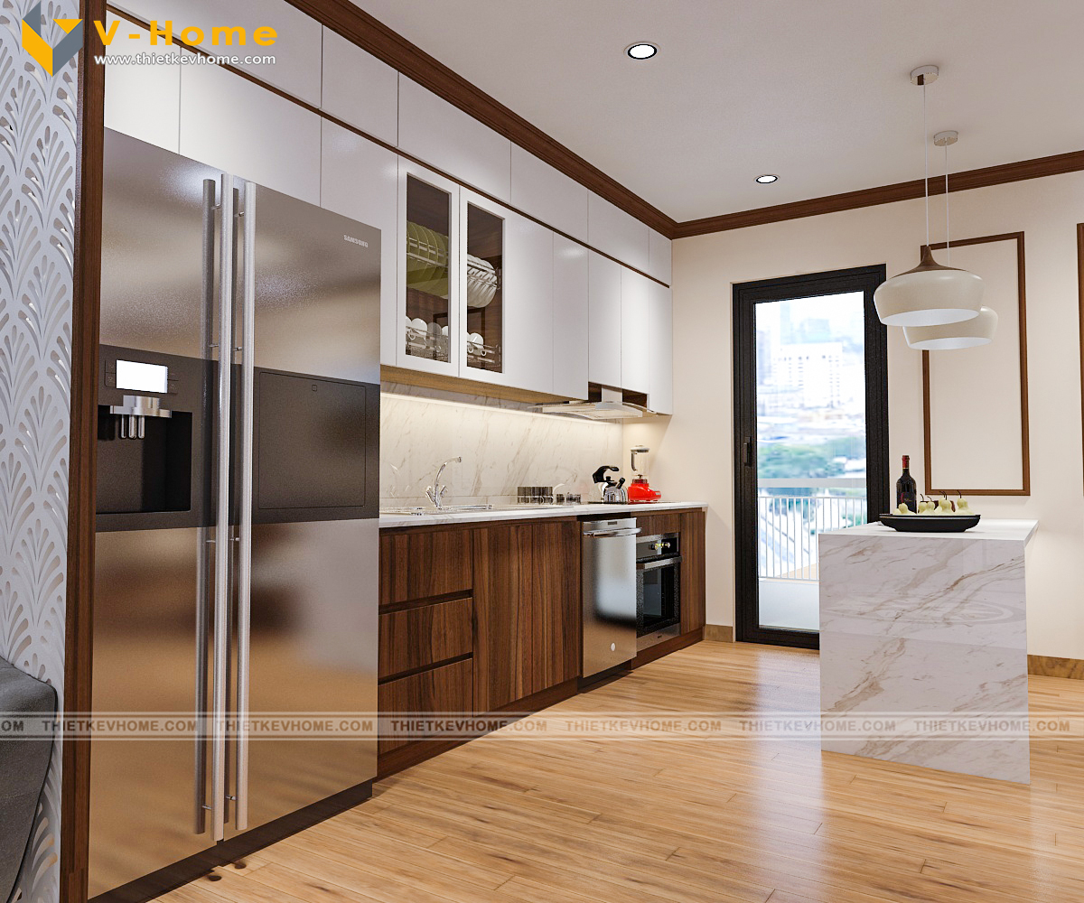 Thiết kế nội thất chung cư thường chú trọng đến yếu tố công năng, đảm bảo tối ưu diện tích không gian sống. Tủ bếp được thiết kế kịch trần giúp tăng không gian lưu trữ, vì bản chất các căn hộ chung cư thường không có không gian lưu trữ riêng, nên các hệ tủ sẽ được thiết kế kịch trần, không gian sống trở lên gọn gàng và tiện ích hơn.