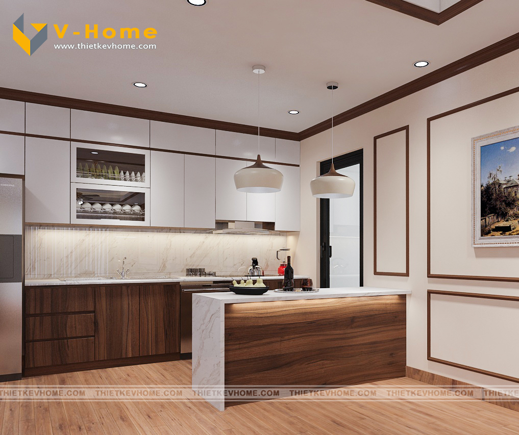 Quầy bar được thiết kế đơn giản hiện đại với mặt đá marble trắng quắc vân mang lại vẻ đẹp sang trọng, đẳng cấp cho không gian nội thất. Đồng thời, quầy bar cũng giúp ngăn cách không gian phòng bếp và phòng ăn, cũng là nơi để bày biện thức ăn chuẩn bị cho bữa cơm gia đình.