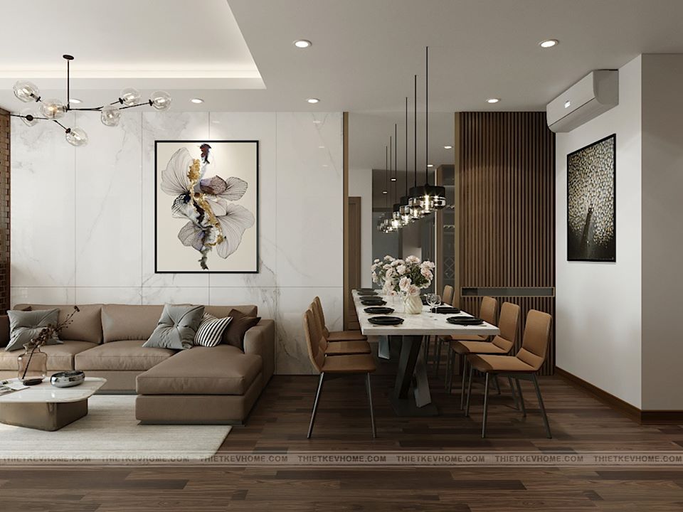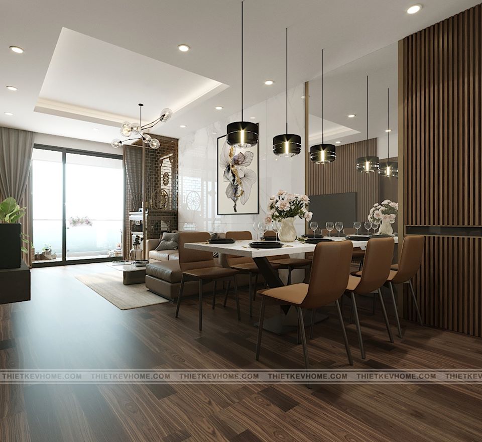 Sự liên thông giữa phòng khách và phòng đến cho căn hộ chung cư được đồng nhất trong thiết kế nội thất hiện đại. Phòng ăn được sử dụng với không gian diện tích rộng rãi, thông thoáng. Bàn ăn được làm bằng gỗ tráng bóng sang trọng dễ dàng cho việc lau dọn, 6 chiếc ghế được bọc nỉ êm ái và sang trọng.