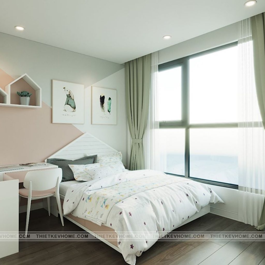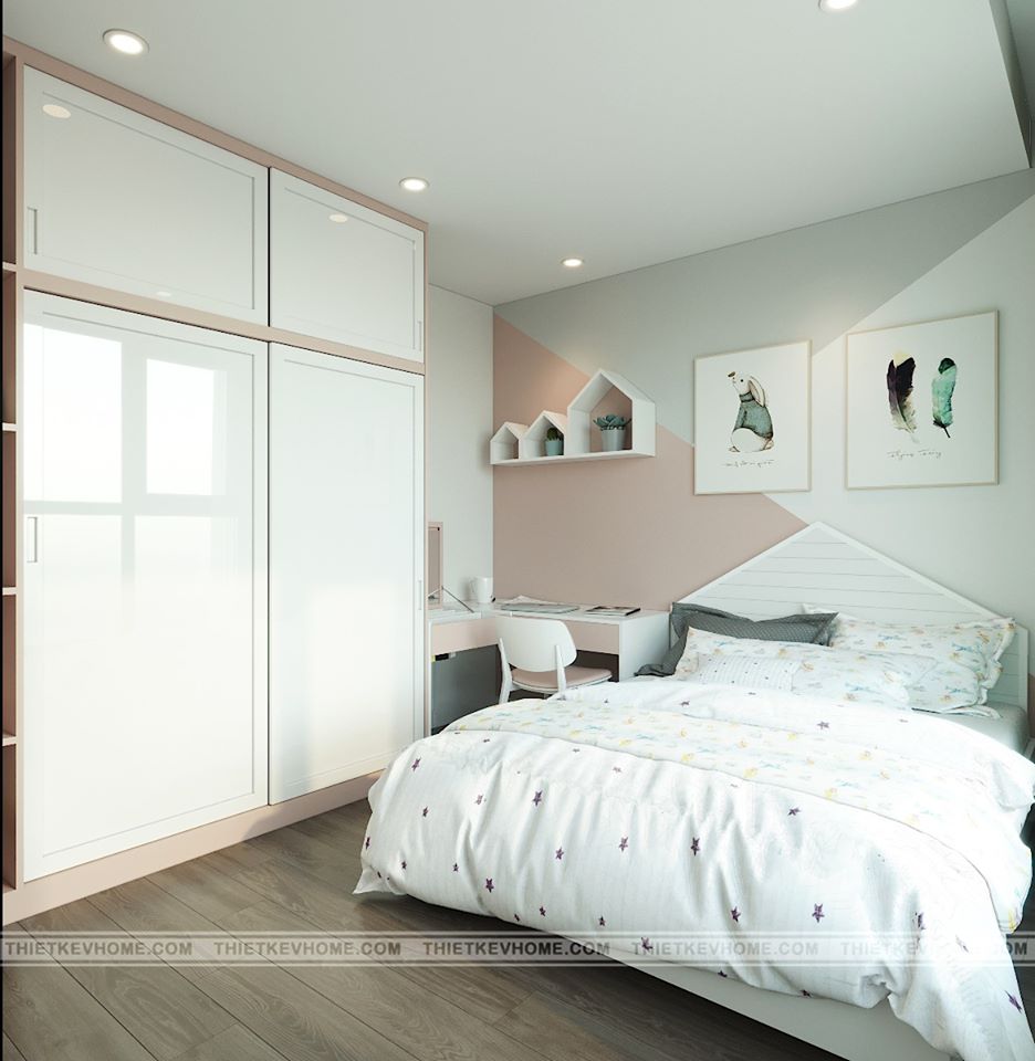 Phòng ngủ của bé được bố trí và sử dụng tông màu hồng nhạt tạo điểm nhấn tông màu trong căn phòng ngủ, chúng còn thể hiện mang đến sự đáng yêu, đúng chuẩn gam màu yêu thích của những nàng công chúa đáng yêu. Giường ngủ được đặt chính giữa căn phòng, đầu giường sử dụng mẫu giấy dán tường với hình họa tiết đáng yêu. Tủ quần áo được sử dụng chất liệu gỗ công nghiệp với cửa tủ trượt màu trắng đáng yêu. Bên cạnh được thiết kế bàn học cho trẻ mang đến cho bé có được không gian học tập được tốt nhất. Bàn học được bố trí phía dưới một cách gọn gàng, tiện lợi, giúp cho bé có được sự thoải mái, mang đến được góc tập để bé có được đảm không gian tiện nghi.
