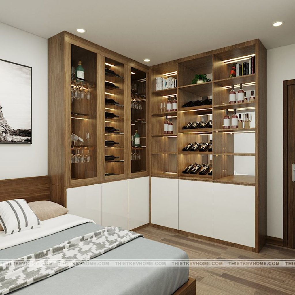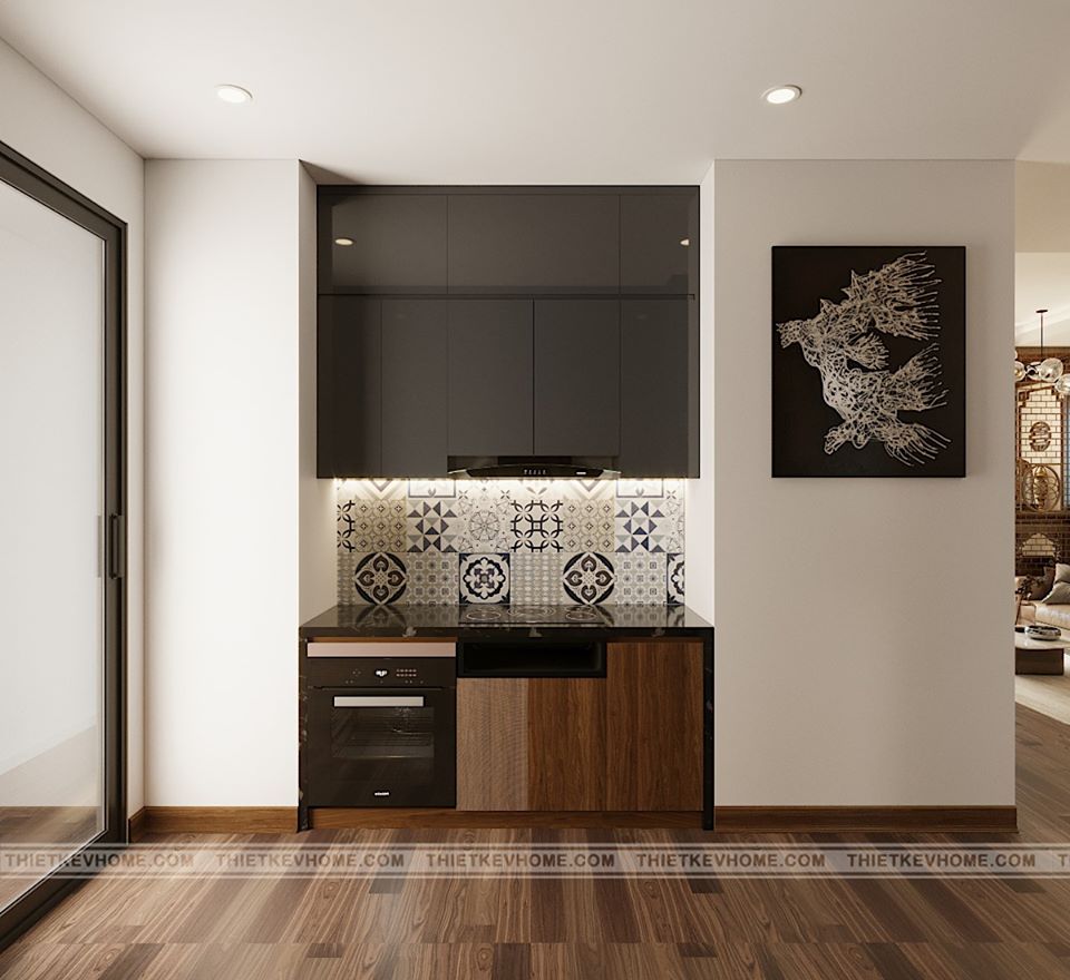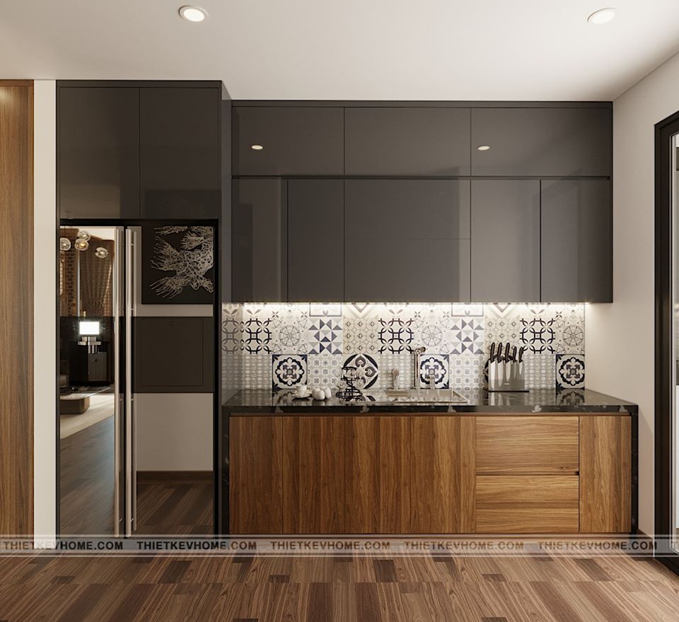 Phòng bếp được bao phủ được sử dụng bằng chất liệu gỗ óc chó sang trọng, căn phòng được kết nối với không gian trở nên sách sẽ. Tủ bếp trên và tủ bếp dưới được trở nên khơi nới diện tích sử dụng được mang đến những nét hiện đại. Không gian tạo được sự ngăn cách cần thiết cho các không gian chức năng.Thiết kế nội thất được sử dụng với những đường nét phào chỉ tạo điểm nhấn cho cho căn phòng bếp hiện đại.
