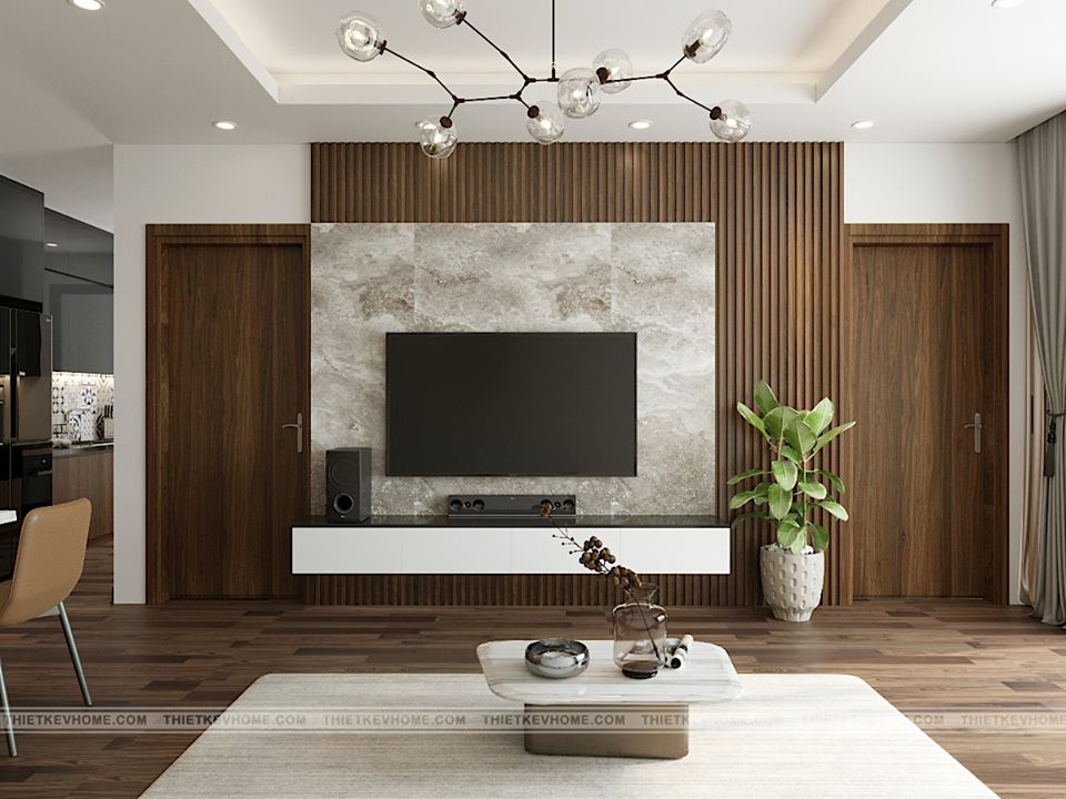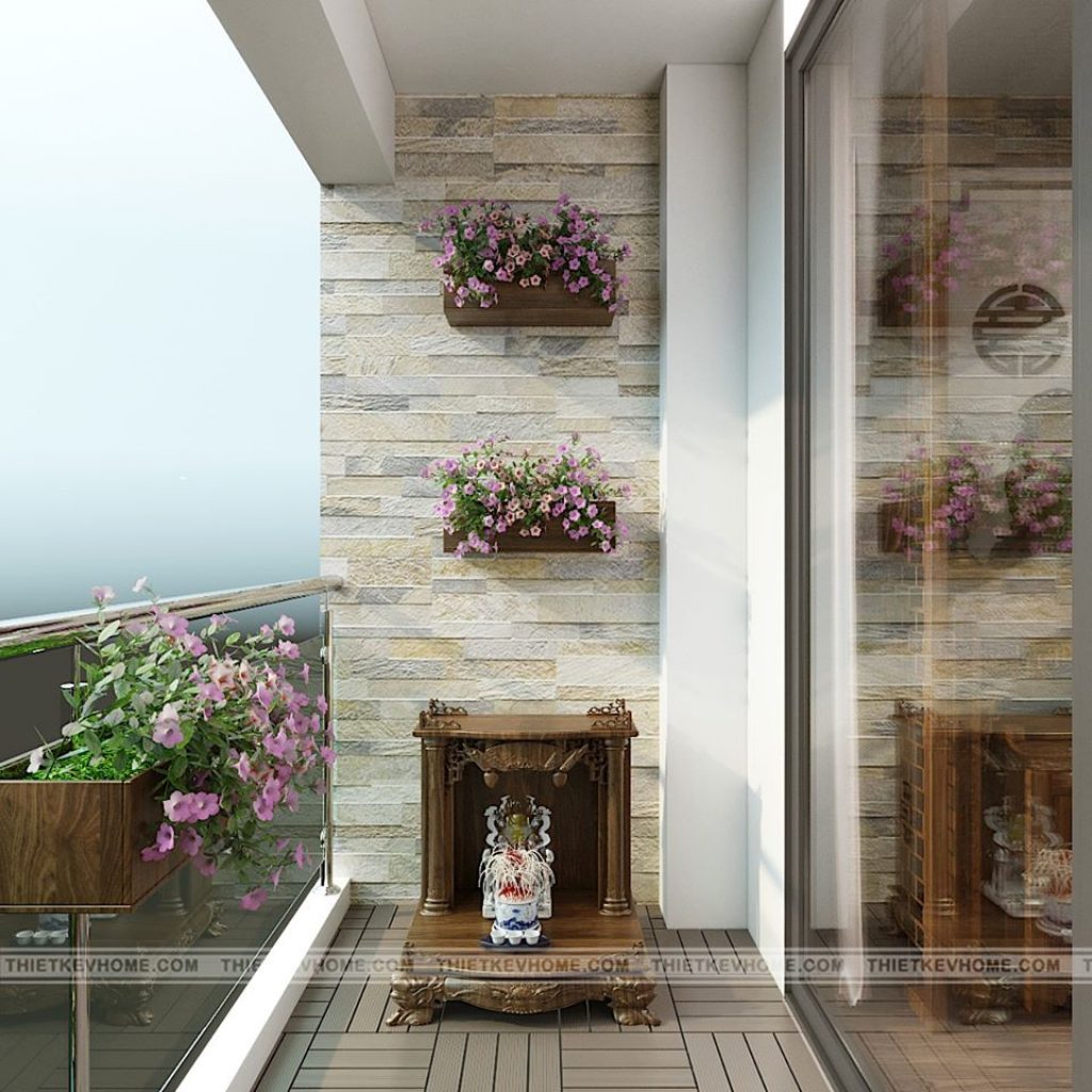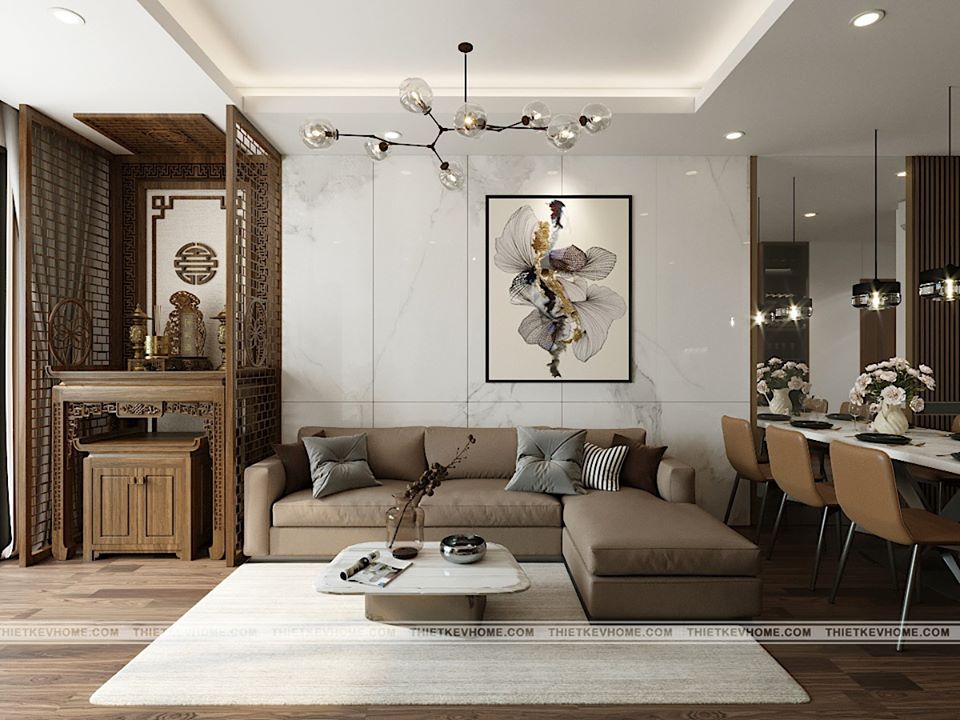 Phòng khách được sử dụng với tông màu trắng mang đến cho căn phòng được sang trọng, không kém phần tinh tế. Sofa được làm bằng chất liệu bọc nỉ, màu nâu trong được sử dụng cho căn phòng được nổi bật. Bức tường phía sau sofa được sử dụng tấm vách ốp màu trắng mang đến cho không gian càng được trở nên tinh tế, nhẹ nhàng và bao quát toàn bộ nội thất giữa những gam màu được sử dụng cho căn phòng được trở nên đẹp mắt. Chiếc bàn trà được sử dụng với kiểu dáng độc đáo, mặt bàn sử dụng kính trắng, phía dưới sử dụng tấm thảm được trở nên quý phái. Thiết kế kệ tivi được sử dụng mang đến cho căn phòng được trở nên sang trọng, chất liệu sử dụng được toát lên cho căn phòng được ấn tượng và độc đáo. Cửa ban công giúp cho căn phòng có được ánh sáng tự nhiên một cách tối ưu nhất, căn phòng được bao phủ toàn bộ ánh sáng đất trời. Không gian bàn thờ được yên tĩnh, trầm lắng, mang đến cho bàn thờ được thể hiện sự trang nghiêm, tôn trọng, nơi linh thiêng thờ cúng.