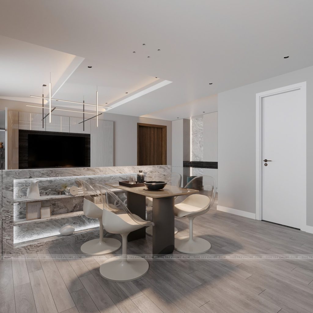 Điểm sáng tạo nhất trong không gian này chính là việc chúng tôi sử dụng hệ vách ngăn lửng bằng đá Marble vân xám khói. Không chỉ khéo léo phân chia khu vực bàn ăn và phòng khách, hệ vách này còn tích hợp kệ trang trí với ánh sáng LED âm bản, biến một vật dụng phân cách trở thành một tác phẩm nghệ thuật trưng bày đầy cuốn hút.