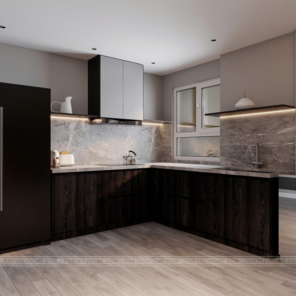 - Sự kết hợp giữa hệ tủ gỗ đen nhám và vách ốp màu xám sáng tạo nên độ tương phản mạnh mẽ nhưng vẫn vô cùng sang trọng.