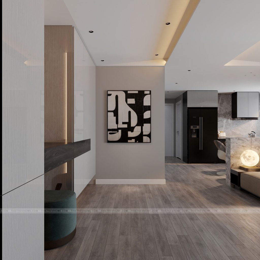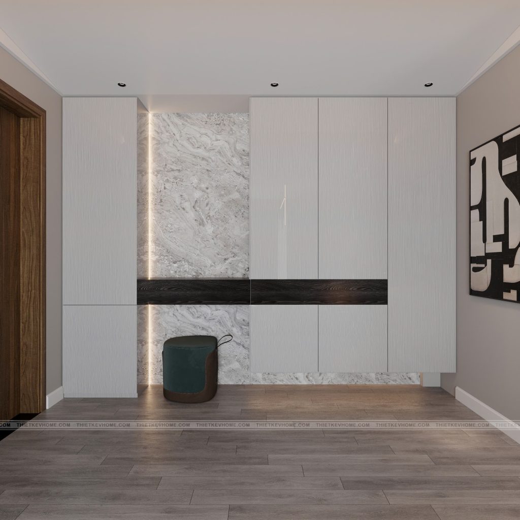 Hệ tủ âm tường kịch trần – giải pháp lưu trữ thông minh giúp tối ưu diện tích, giữ cho không gian luôn gọn gàng mà vẫn đảm bảo tính thẩm mỹ đồng nhất; kèm đèn hắt khe sáng tạo sự nhẹ nhàng của những mảng sáng tối mềm mại, tinh tế. Bên cạnh đó, sự kết hợp giữa đá marble vân mây sang trọng và gỗ công nghiệp cao cấp không chỉ đảm bảo độ bền mà còn tôn lên vẻ thời thượng cho căn hộ.