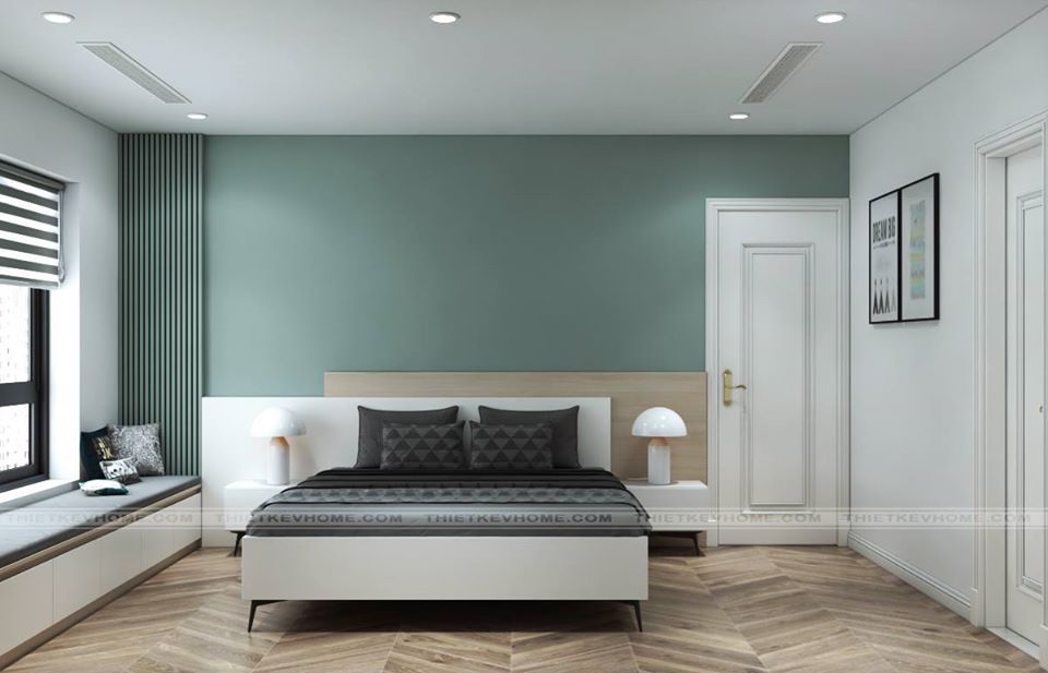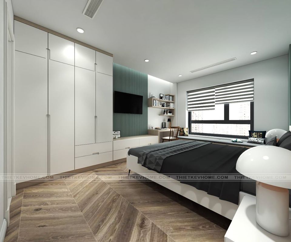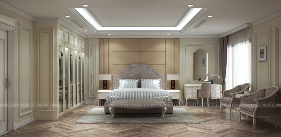 Phòng ngủ master được thiết kế theo phong cách đương đại, đơn giản mang đến một không gian rộng rãi, thông thoáng, xua tan đi sự bí bách, chật chội do diện tích hạn chế mang lại. Nội thất phòng ngủ master tuy thiết kế đơn giản nhưng vẫn đảm bảo đầy đủ công năng. Giường ngủ được đặt giữa trung tâm của căn phòng, cân đối và hài hòa. Đầu giường kiến trúc sư sử dụng vách ốp tường để trang trí tạo điểm nhấn, nổi bật. Bàn trang điểm treo tường không chiếm quá nhiều không gian diện tích. Tủ quần áo được thiết kế vào bên trong tường để đảm bảo không chiếm nhiều diện tích, mà vẫn được đảm bảo được tính công năng của nó. Trần nhà được thiết kế giật cấp, hệ thống đèn trần cách âm. Màu sắc vàng nhạt mang đến không gian được ấm áp, kết hợp với màu tím pastal của nội thất. Sự trung hòa đến hoàn hảo một cách tinh tế, qua bàn tay của các kiến trúc Vhome mang đến cho phòng ngủ của bạn được sang trọng, nhẹ nhàng, mà vẫn toát lên được khí chất của người sử dụng thiết kế đó.