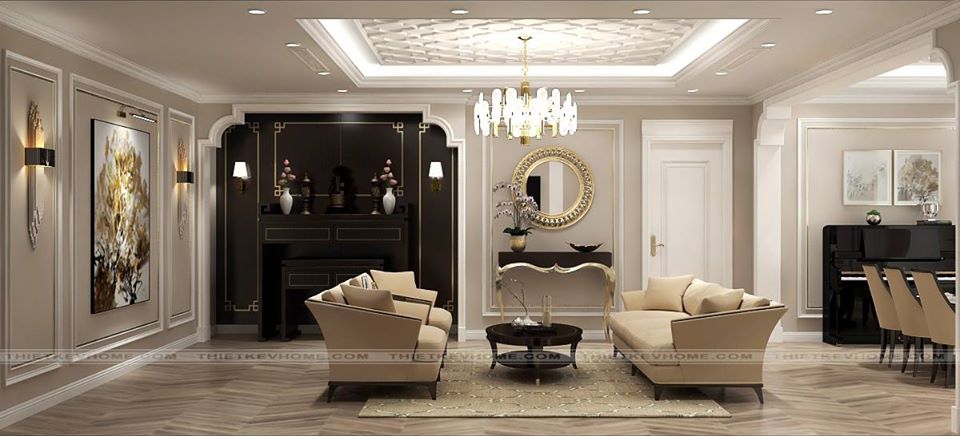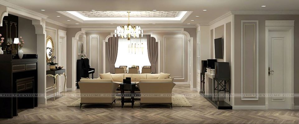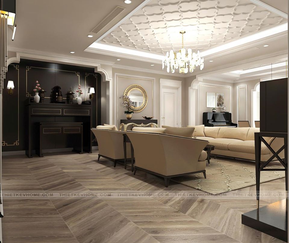 Nội thất được sử dụng trong căn phòng khách bao gồm bộ sofa hiện đại khung gỗ tự nhiên được bao bọc bởi lớp nỉ mềm mại. Bàn trà gỗ với thiết kế mới lạ hút mắt người nhìn. Bức tường sau sofa sử dụng tấm gương với kiểu dáng yểu điệu kết hợp với chiếc bàn đặt chậu lan hồ điệp mang đến cho căn phòng càng được trở nên tinh tế, nhã nhặn. Một điểm nhấn cho căn phòng không thể rời mắt khỏi nó. Trần nhà được thiết kế giật cấp, giữa căn phòng được sử dụng chiếc đèn chùm kiểu dáng tinh tế phù hợp với không gian nội thất, phong cách thiết kế căn hộ. Hệ thống đèn trần cách âm, với ánh sáng vàng giúp cho căn phòng được ấm áp,