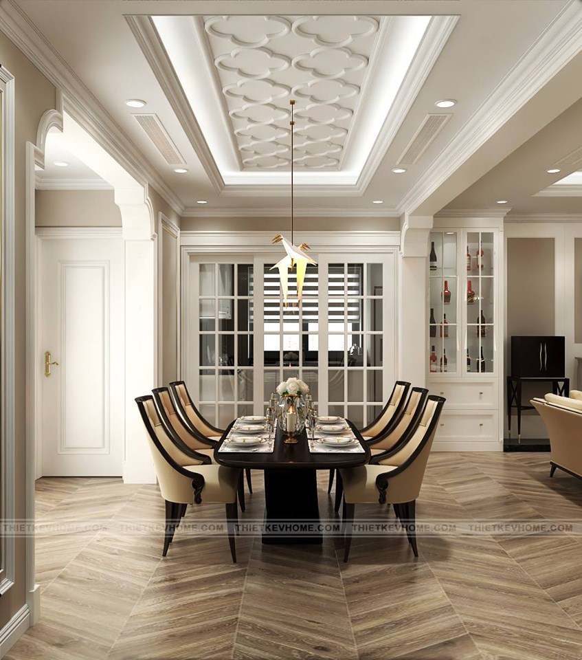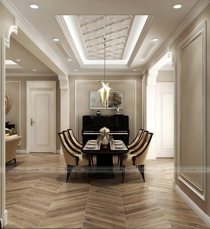 Thiết kế nội thất phòng ăn được liên kề phòng khách mang lại sự thông thoáng, liền mạch trong thiết kế. Bàn ăn được sử dụng gỗ óc cho màu nâu sẫm, 6 chiếc ghế được bọc nỉ êm ái cho thành viên gia đình được sử dụng được thoải mái. Chiếc đàn piano được đặt ngay cạnh bàn ăn, mang đến một bầu không khí như được nắng đọng lại trong vùng trời đầy nghệ thuật. Các thành viên gia đình quây quần bên nhau, ấm áp, tràn hòa, lãng mạn, đáng yêu đến lạ thường.