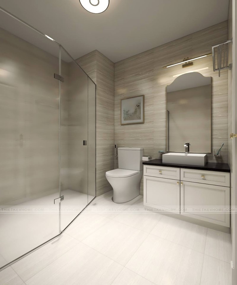 Thiết kế phòng wc chung hiện đại sử dụng vách kính tắm đứng mang lại cảm giác cơi nới không gian, khô thoáng cho không gian wc. Trang thiết bị vệ sinh hiện đại