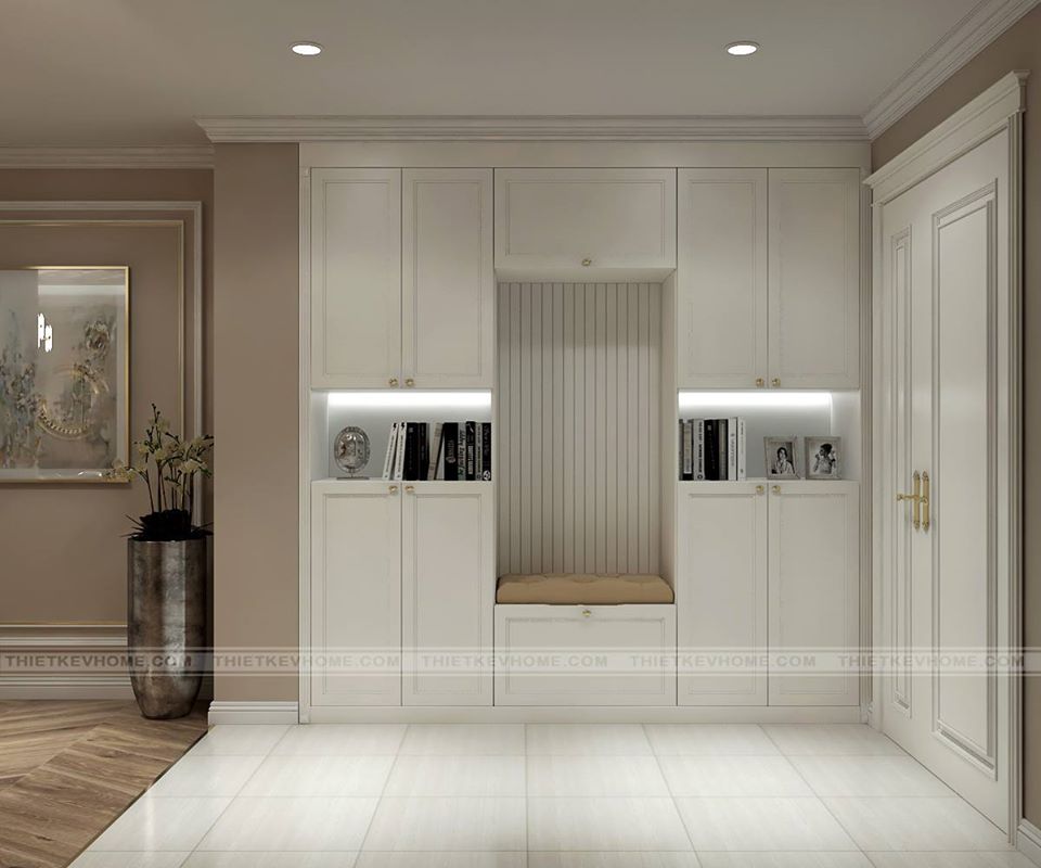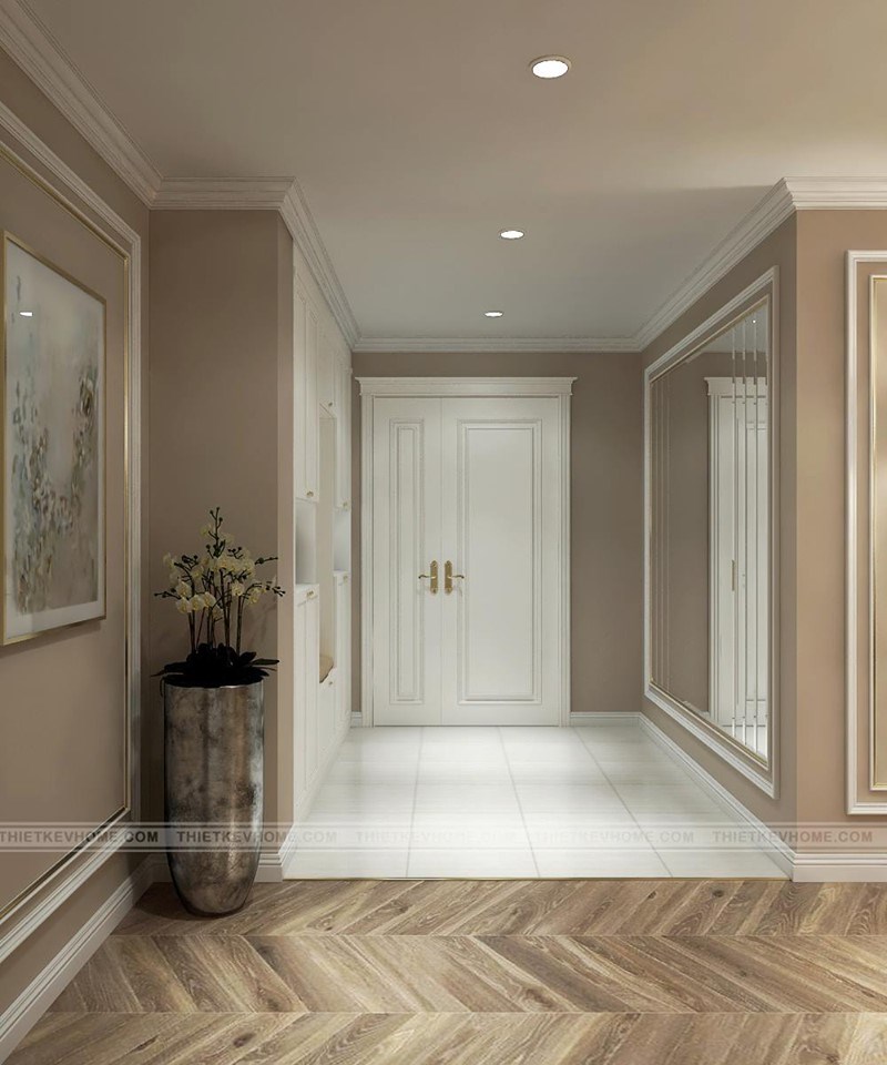 Khi bước chân vào căn hộ ta đã thấy 1 phong cách đương đại được bao chùm cho toàn bộ căn hộ chung cư N04 Hoàng Đạo Thúy. Tủ để giầy đặt ở vị trí gần cửa ra vào, đảm bảo tính công năng sử dụng. Sự đẹp mắt của thiết kế tủ đựng giầy kết hợp với tủ đựng đồ, nhằm tạo không gian sử dụng được rộng rãi. Phía đối diện được lựa chọn với chiếc gương lớn để nhằm cho việc giúp chủ nhà khi ra đường được tươm tất nhất có thể hoặc có thể ngắm nhìn mình chỉnh chu, mỗi lần đi ra khỏi nhà.