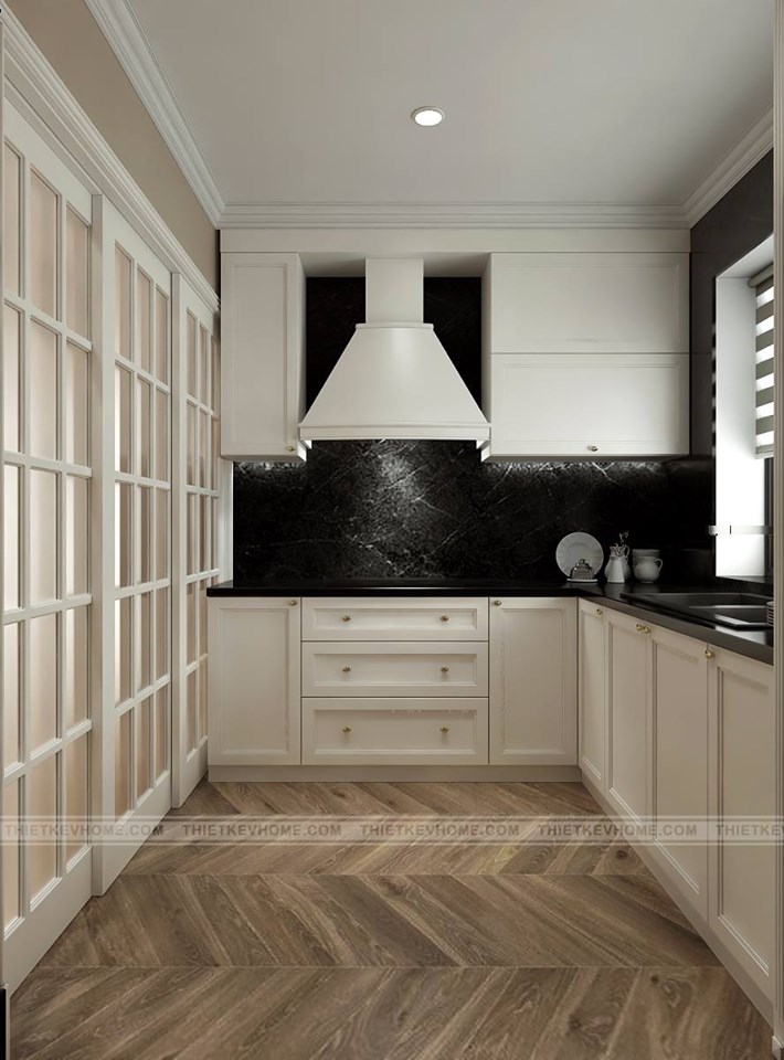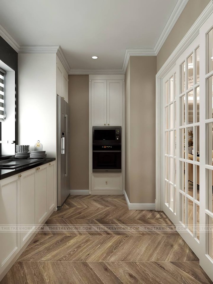 Khu vực bếp nấu được thiết kế với hình dạng chữ L không chỉ phù hợp với cấu trúc căn hộ mà còn rất tiện nghi hiện đại. Hệ tủ bếp được sử dụng chất liệu gỗ MDF chống ẩm và không bị cong vệnh mối mọt. Nội thất phòng bếp được thiết kế hết sức đơn giản nhưng đảm bảo đầy đủ công năng tiện ích. Phòng bếp được thiết kế ngăn cách với không gian phòng ăn bởi tấm vách cửa kính kéo, để giúp cho nữ gia chủ sử dụng trong trình nấu ăn mùi thức ăn bay khắp nhà. Sự sắp xếp, phân chia, bố cục được các kiến trúc sư bố trí hợp lý cho diện tích căn phòng.