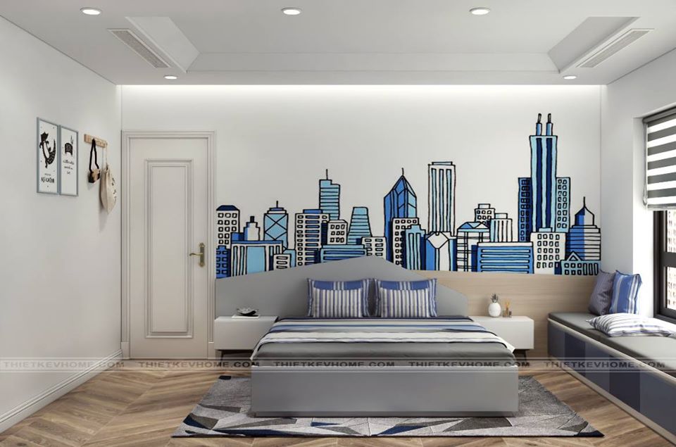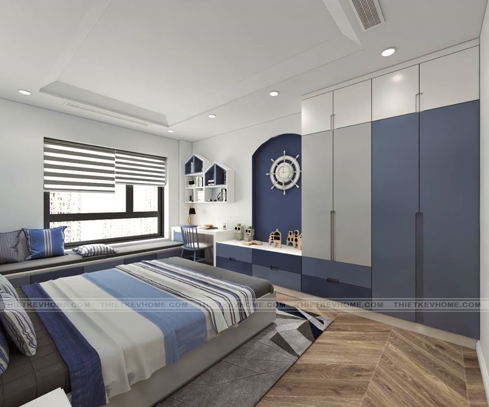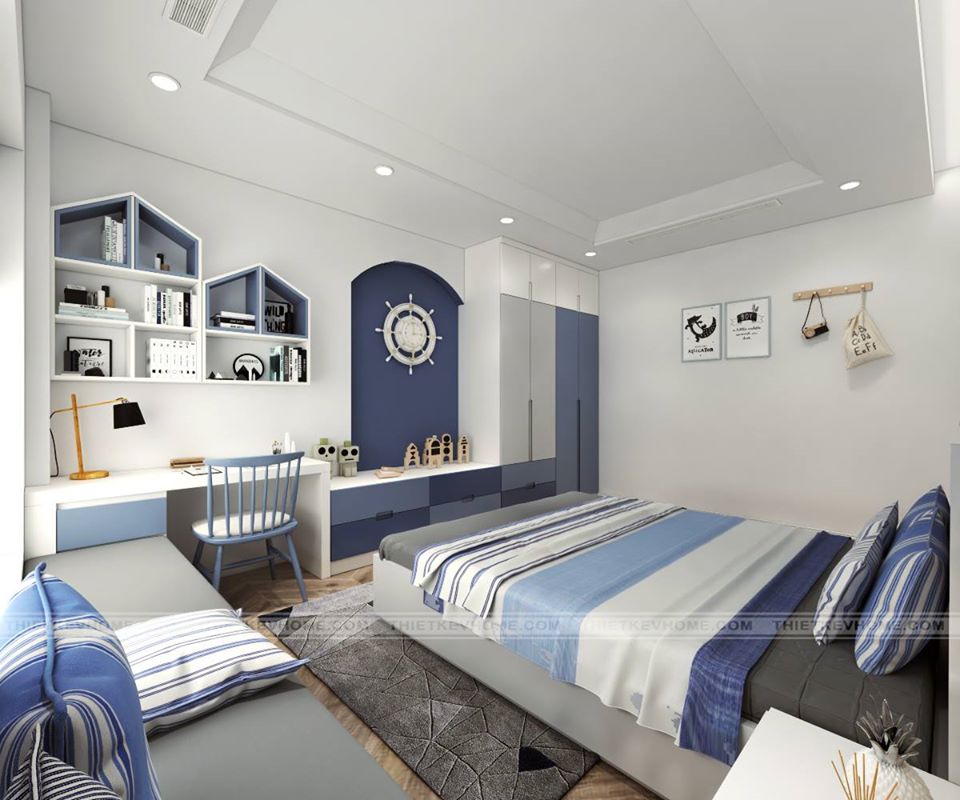 Thiết kế phòng ngủ con mang đến một không gian vô cùng tinh nghịch, sáng tạo, với gam màu xanh dương làm điểm nhấn. Bức tranh được vẽ trên tường mang đến điểm nhấn cho toàn thể căn phòng. Chiếc ghế dài được đặt bên cửa sổ, mang đến một góc nhỏ cho bé để nghỉ ngơi thư giãn, hay như đôi khi còn tắm mình dưới ánh nắng vào buồi sáng. Giường ngủ được đặt chính giữa, đối diện giường là sự kết hợp giữa bàn học và tủ quần áo.