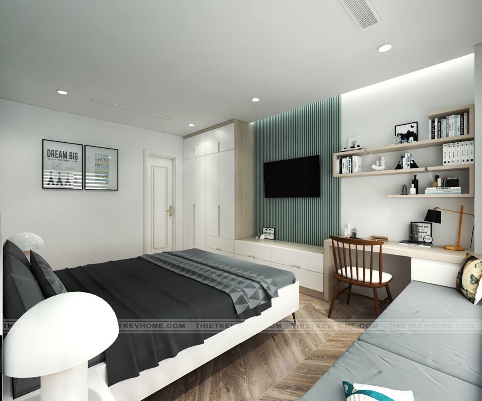 Với phương châm rẻ và đẹp nhưng vẫn phải đảm bảo chất lượng. Thiết kế nội thất phòng ngủ này được sử dụng mẫu giấy dán tường, tấm bảng gỗ màu xanh lá sẫm để tạo điểm nổi bật. Phong cách hiện đại được sử dụng cho thiết kế nội thất phòng thứ 2 mang đến sự nắng động, tinh tế qua cách sắp nội thất. Tủ quần áo được kết hợp với kệ tivi, mang đến một không gian được thông thoáng, rộng rãi. Bên cạnh là bàn học được gần cửa sổ, giúp cho việc sử dụng được thoải mái, thuận tiện.