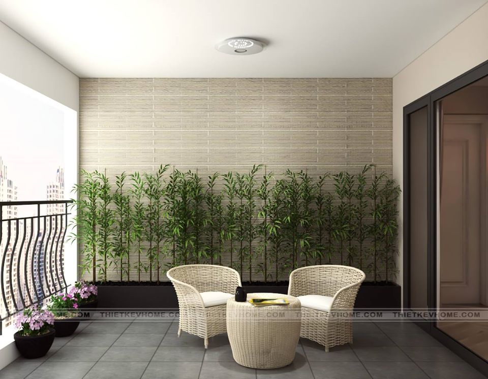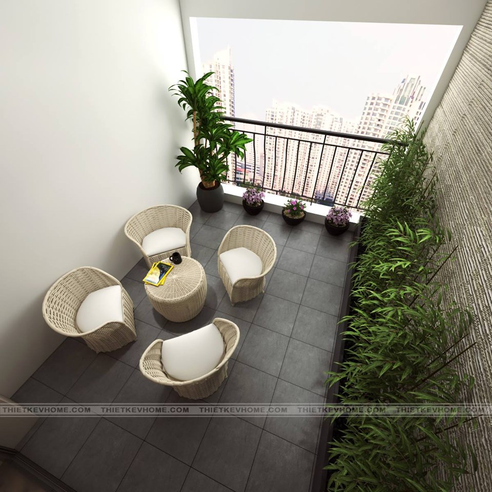 Và cuối cùng là thiết kế ban công, được trang trí bằng những chậu cây xanh và bộ bàn ghế thư giãn nhâm nhi tách cafe mỗi khi gia chủ rảnh rỗi ngồi ngắm nhìn thành phố từ góc ban công nhà mình.