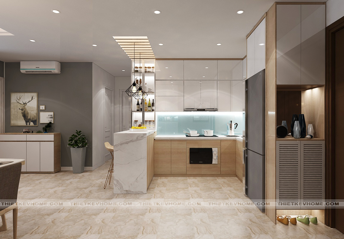 Thiết kế nội thất phòng bếp đơn giản, hiện đại nhưng tiện nghi và đầy đủ công năng. Thiết kế tủ giày ngay cửa ra vào là dụng ý của kiến trúc sư. Về mặt công năng, thì thiết kế tủ giày ở vị trí cửa ra vào là hợp lý, tiện ích cho người sử dụng. Về mặt thẩm mĩ và xử lý hiện trạng, thì tủ giày ở vị trí có giúp giấu đi vị trí của attomat tổng.