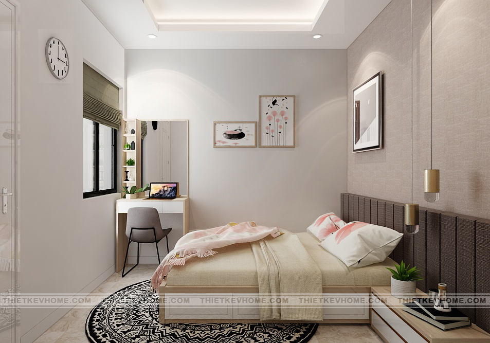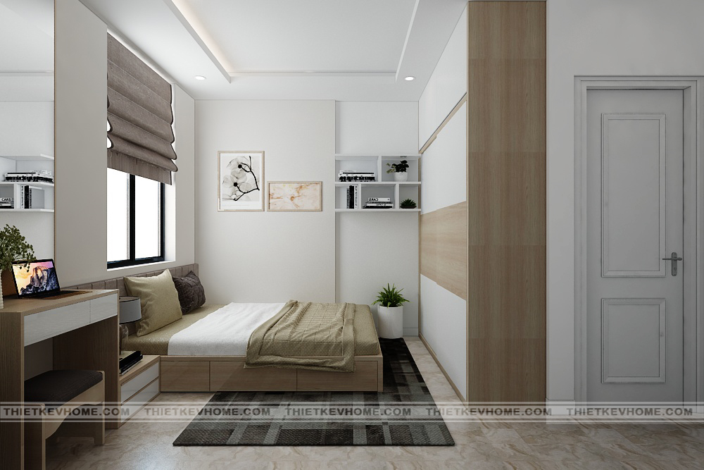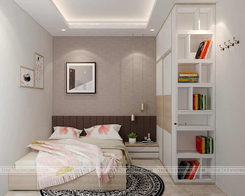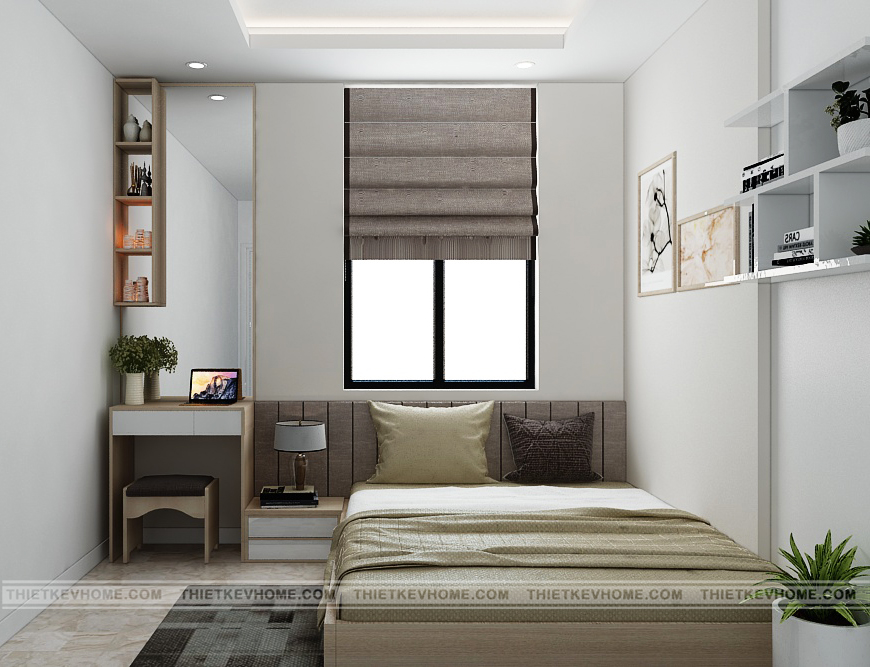 Thiết kế nội thất phòng ngủ con đơn giản, hiện đại nhưng mang một vẻ đẹp cuốn hút nhờ sự trang trí nội thất sáng tạo, độc đáo. Gam màu thiết kế nhẹ nhàng rất phù hợp với gia chủ ưa thích sự gọn gàng, thanh lý, không thích sự rườm rà, rối mắt. Phòng ngủ nhỏ nhưng nhờ sự sắp xếp khoa học và hợp lý nên vẫn đầy đủ tiện ích.