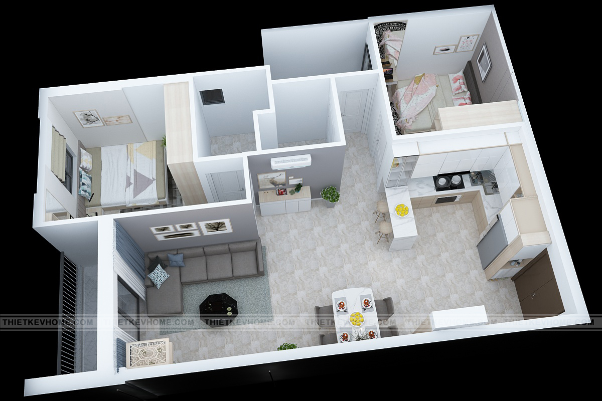 Căn hộ chung cư 70m2 với các không gian chức năng được bố trí khoa học, hợp lý: 01 phòng khách bếp, 02 phòng ngủ, 02 phòng wc, 01 ban công và 01 logia. Phòng khách bếp là không gian sinh hoạt chung nên được ưu tiên về diện tích thiết kế, rộng rãi và thoáng mát. Nội thất phòng ngủ có phần khiêm tốn nhưng dưới bàn tay và khối óc của các kiến trúc sư thì phòng ngủ vừa gọn gàng lại đảm bảo đầy đủ công năng.