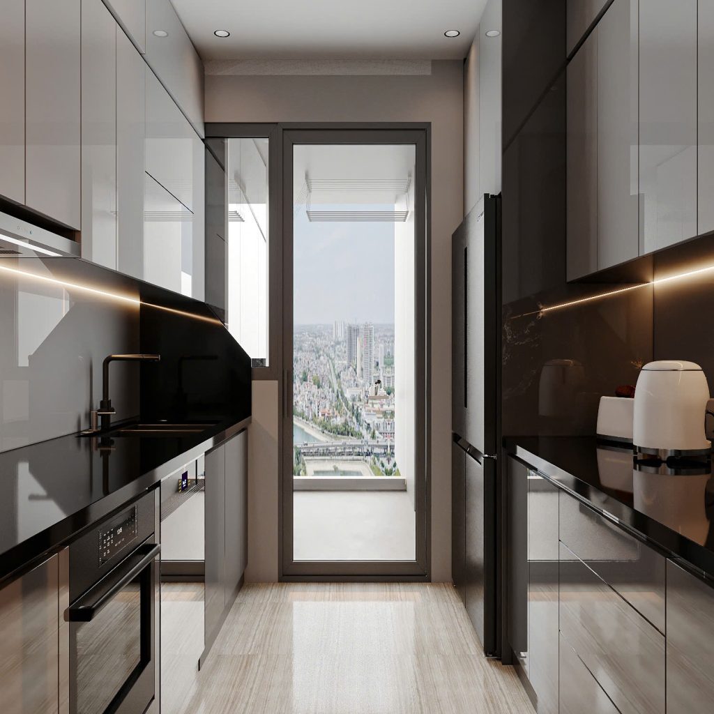 • Kết nối thiên nhiên: Cửa kính lớn dẫn ra ban công giúp đón trọn ánh sáng tự nhiên, giải phóng hoàn toàn cảm giác bí bách thường thấy trong các gian bếp chung cư.