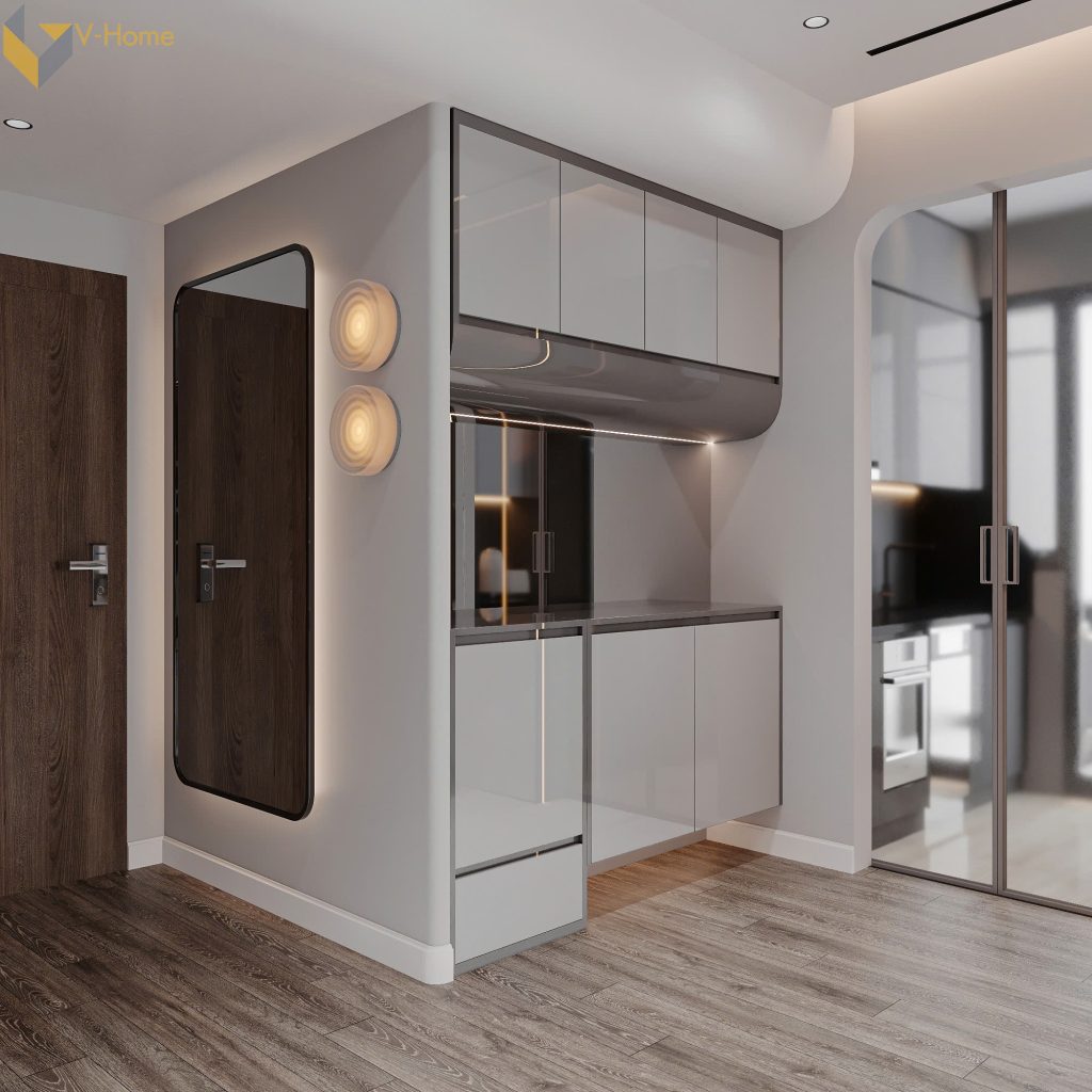 Nhìn vào tổng thể căn hộ, có thể thấy rõ tinh thần ‘Tối giản nhưng bóng bẩy’ (Glossy Minimalist). Điểm nhấn chủ đạo nằm ở việc sử dụng các bề mặt phủ Acrylic bóng gương kết hợp cùng hệ đèn LED trang trí khéo léo, tạo nên một không gian mở, rộng rãi và cực kỳ bắt mắt.