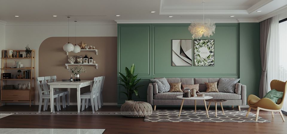 Gam màu xanh được sử dụng cho căn hộ mang đến sự mới lạ và bắt mắt cho toàn bộ nội thất chung cư này. Nội thất được sử dụng gam màu xanh làm điểm nhấn cho toàn bộ không gian nội thất căn hộ chung cư được trở lên thú vị, với sự kết hợp tông màu trắng chủ đạo một cách hòa quyện tinh tế, hiện đại trong nó.