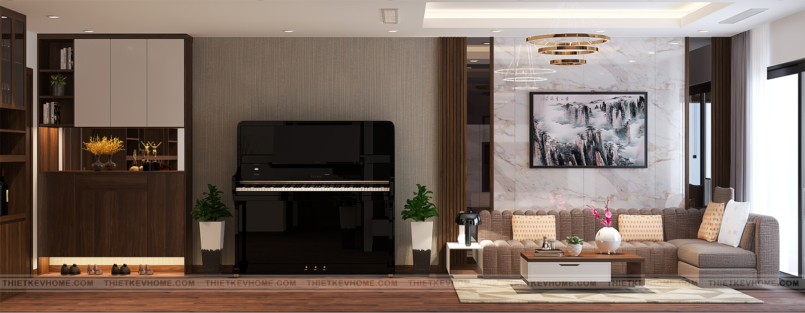 Mở cánh cửa gỗ công nghiệp là hình ảnh không gian sống hoàn hảo của gia đình ba thế hệ. Phía bên tay trái của căn hộ là tủ giày được thiết kế ấn tượng, hiện đại với hệ thống đèn led ánh sáng vàng. Tiếp nối giữa không gian phòng khách và nơi đặt vị trí đàn piano mang lại khoảng thi vị cho cuộc sống, gắn kết các thành viên trong gia đình.