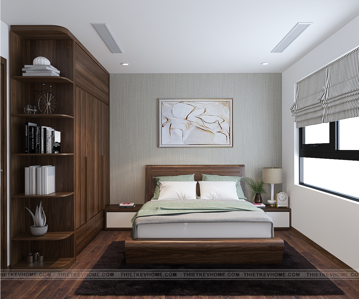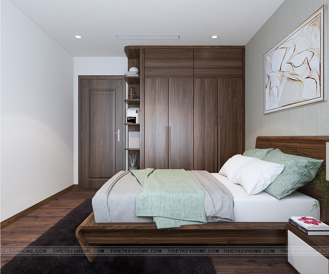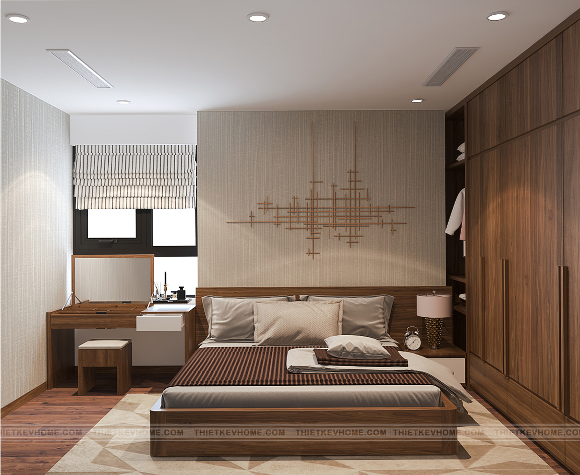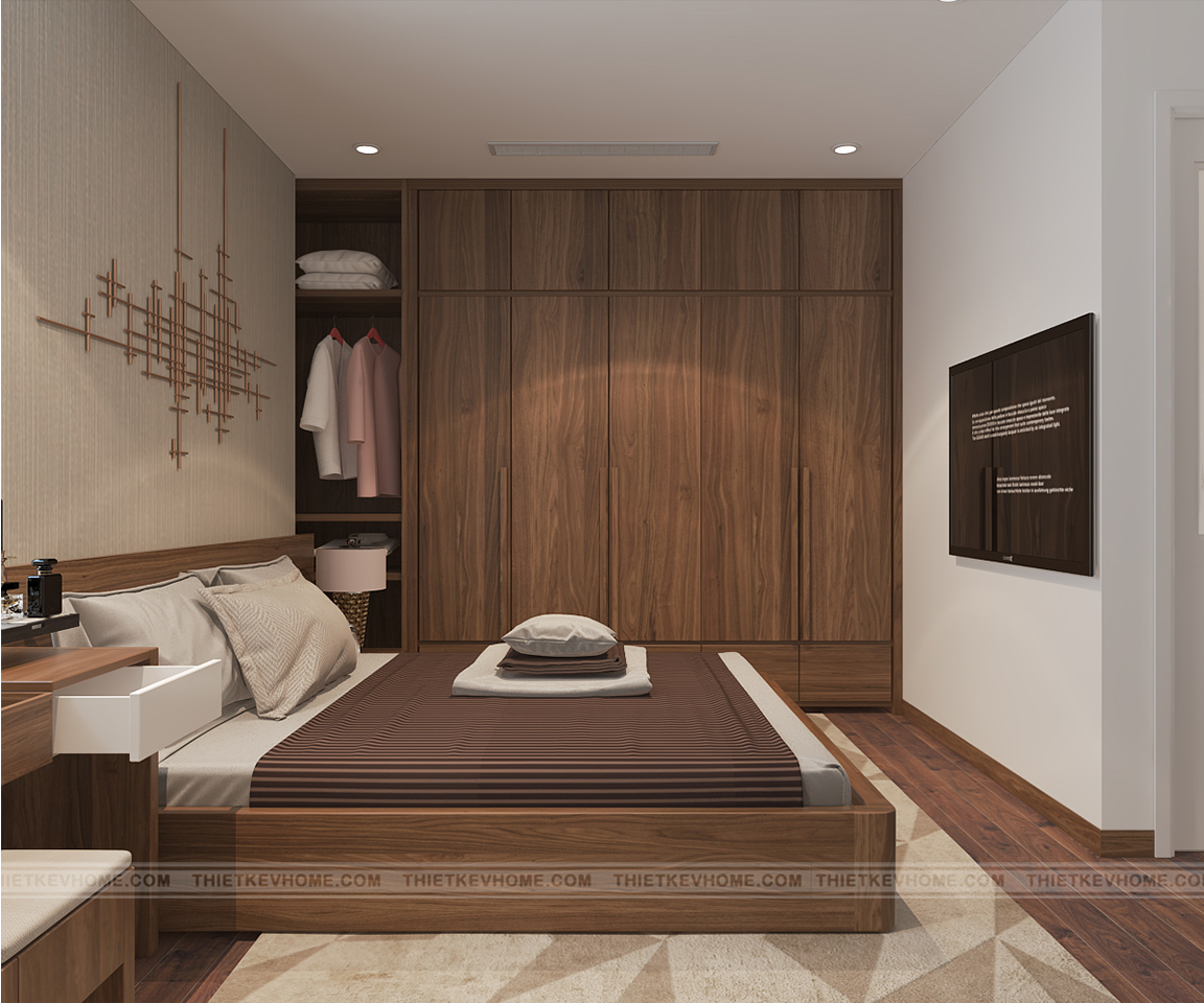 Thiết kế nội thất phòng ngủ master đơn giản hiện đại nhưng lại vô cùng sang trọng và đẳng cấp bởi nội thất gỗ óc chó đem lại. Giường ngủ gỗ tự nhiên óc chó chắc chắn, bền bỉ với đường nét thiết kế khỏe khoắn, trẻ trung. Tủ quần áo cao sát trần cánh mở có tính ứng dụng cao. Bàn trang điểm kết hợp bàn làm việc là thiết kế thông minh tích hợp nhiều công năng trong một sản phẩm, đây cũng là thế mạnh của V-Home, sử dụng nội thất thông minh trong thiết kế nội thất chung cư