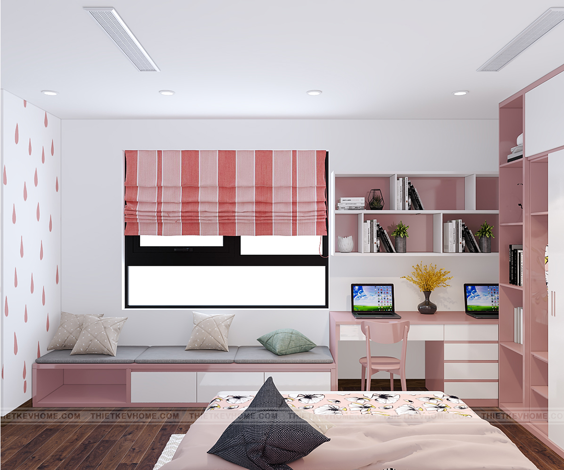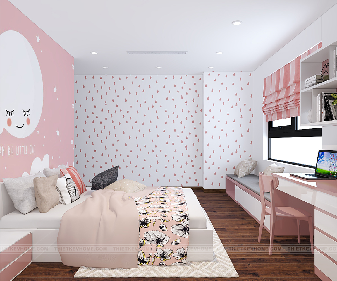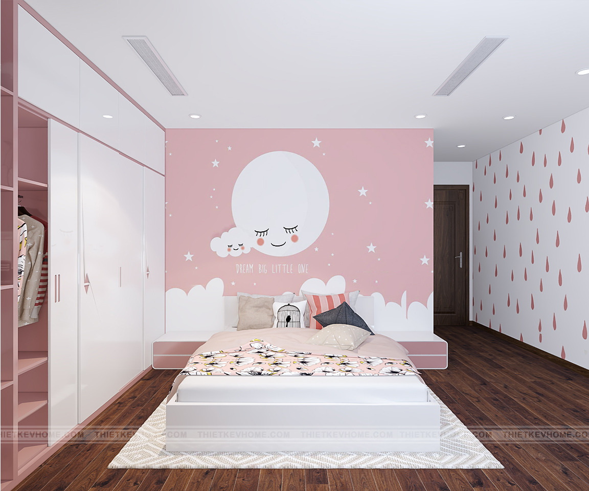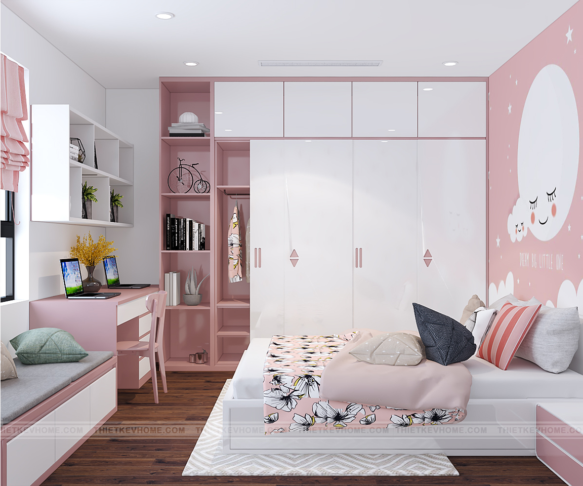 Thiết kế nội thất phòng ngủ con gái tràn ngập màu hồng. Màu hồng mang sự thơ mộng, dịu dàng và nữ tính. Tranh vẽ tường ngộ nghĩnh dễ thương mang lại sự độc đáo, đáng yêu cho nội thất phòng ngủ, mang tới sự hứng khởi cho trẻ. Tủ quần áo hiện đại cánh trượt là sự tính toán chi tiết và hợp lý cho tổng thể không gian diện tích của căn phòng.